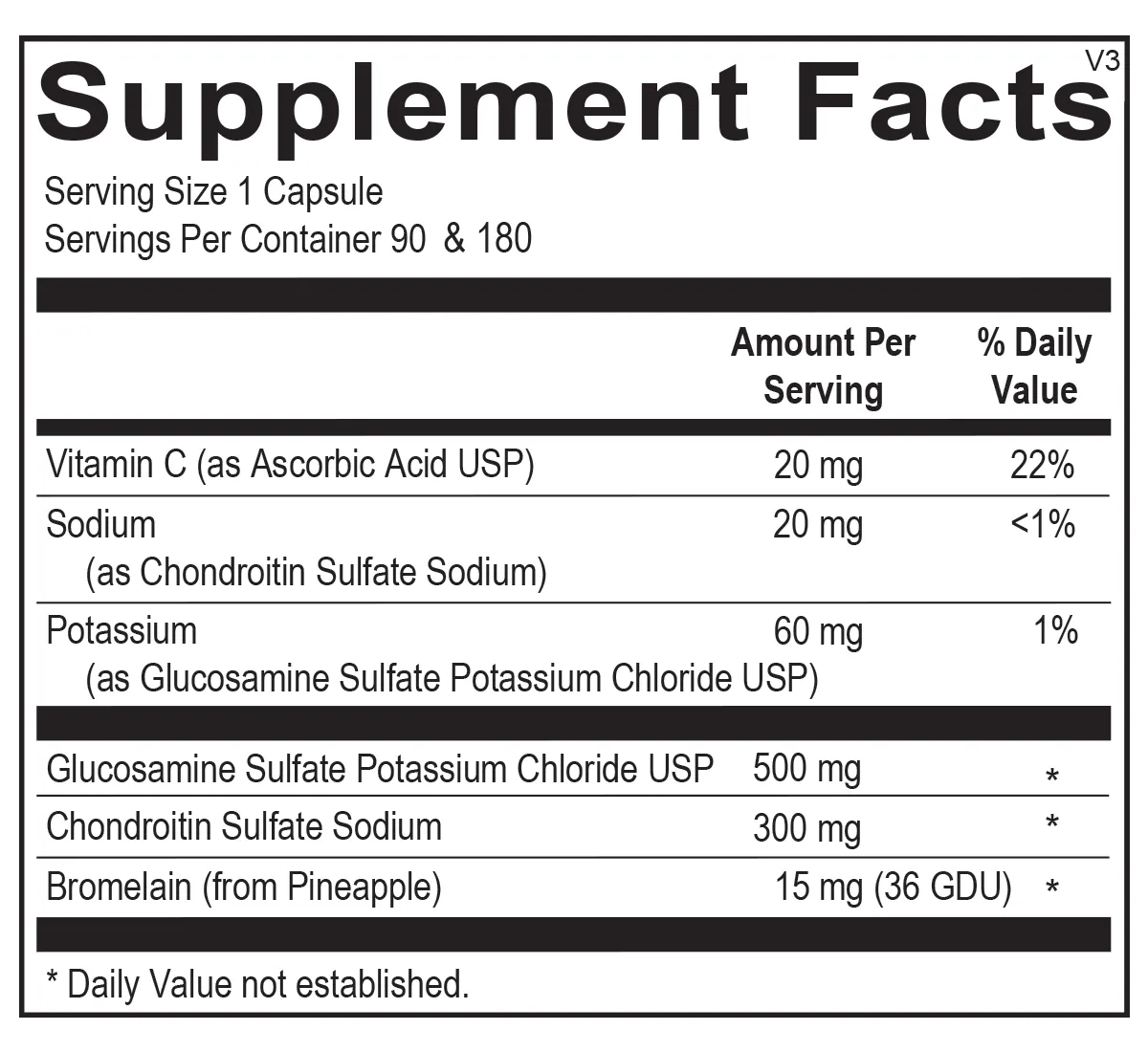 Vitamin C (as Ascorbic Acid USP), Sodium (as Chondroitin Sulfate Sodium), Potassium (as Glucosamine Sulfate Potassium Chloride USP), Glucosamine Sulfate Potassium Chloride USP, Chondroitin Sulfate Sodium, Bromelain (from Pineapple)