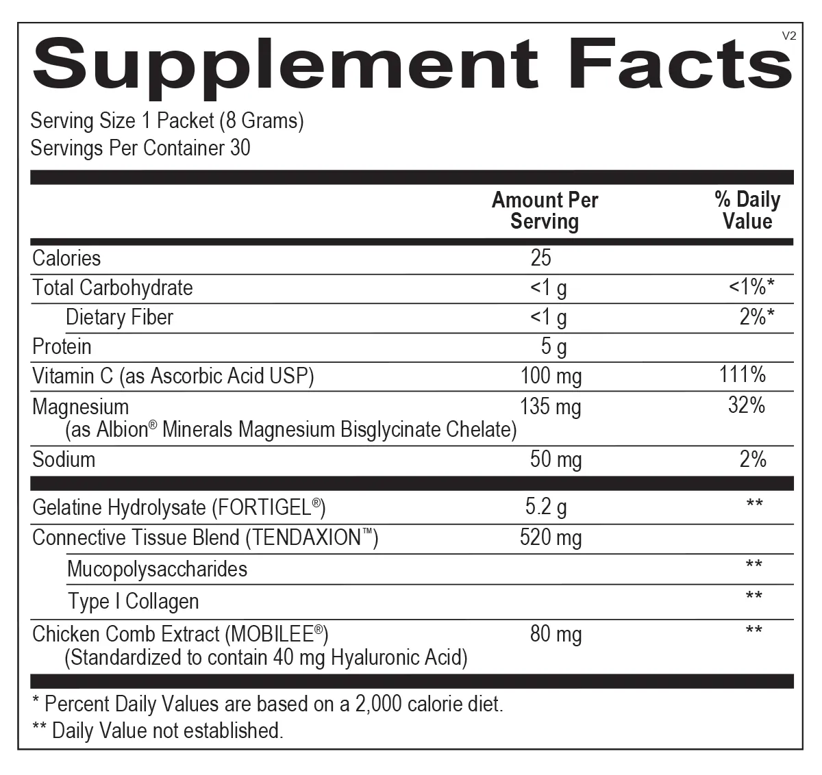 Vitamin C (as Ascorbic Acid USP), Magnesium (as Albion® Minerals Magnesium Bisglycinate Chelate), Sodium, Gelatine Hydrolysate (FORTIGEL®), Connective Tissue Blend (TENDAXION™), Chicken Comb Extract (MOBILEE® (Standardized to contain 40 mg Hyaluronic Acid))