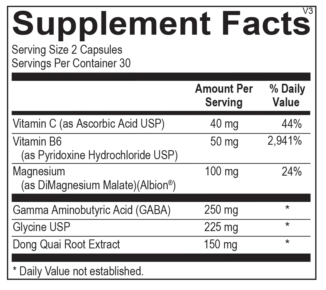 Vitamin C (as Ascorbic Acid USP), Vitamin B6 (as Pyridoxine Hydrochloride USP), Magnesium (as DiMagnesium Malate (AlbionĀ®)), Gamma Aminobutyric Acid (GABA), Glycine (USP), Dong Quai Root Extract