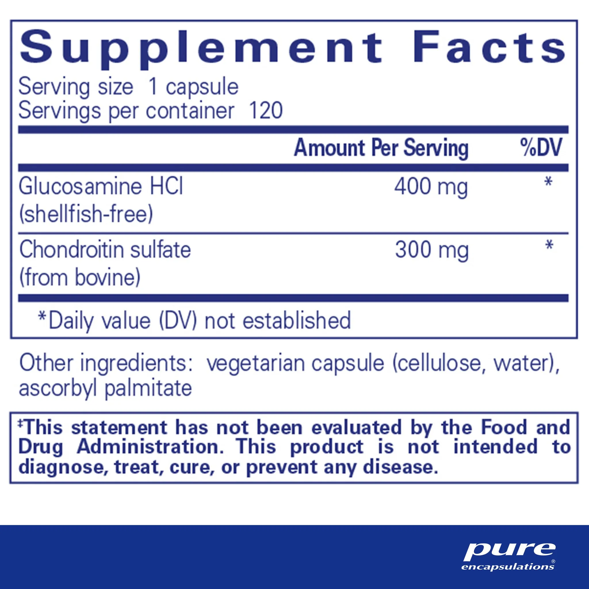 glucosamine HCl (shellfish-free), chondroitin sulfate (from bovine), vegetarian capsule (cellulose, water), ascorbyl palmitate