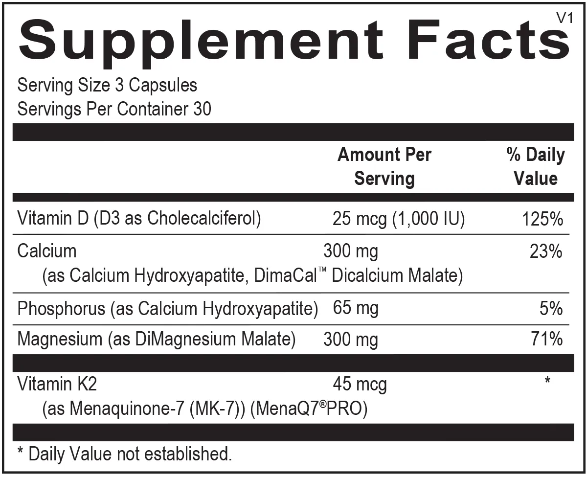 Vitamin D (D3 as Cholecalciferol), Calcium (as Calcium Hydroxyapatite, DimaCal™ Dicalcium Malate), Phosphorus (as Calcium Hydroxyapatite), Magnesium (as DiMagnesium Malate), Vitamin K2 (as Menaquinone-7 (MK-7)) (MenaQ7®PRO))