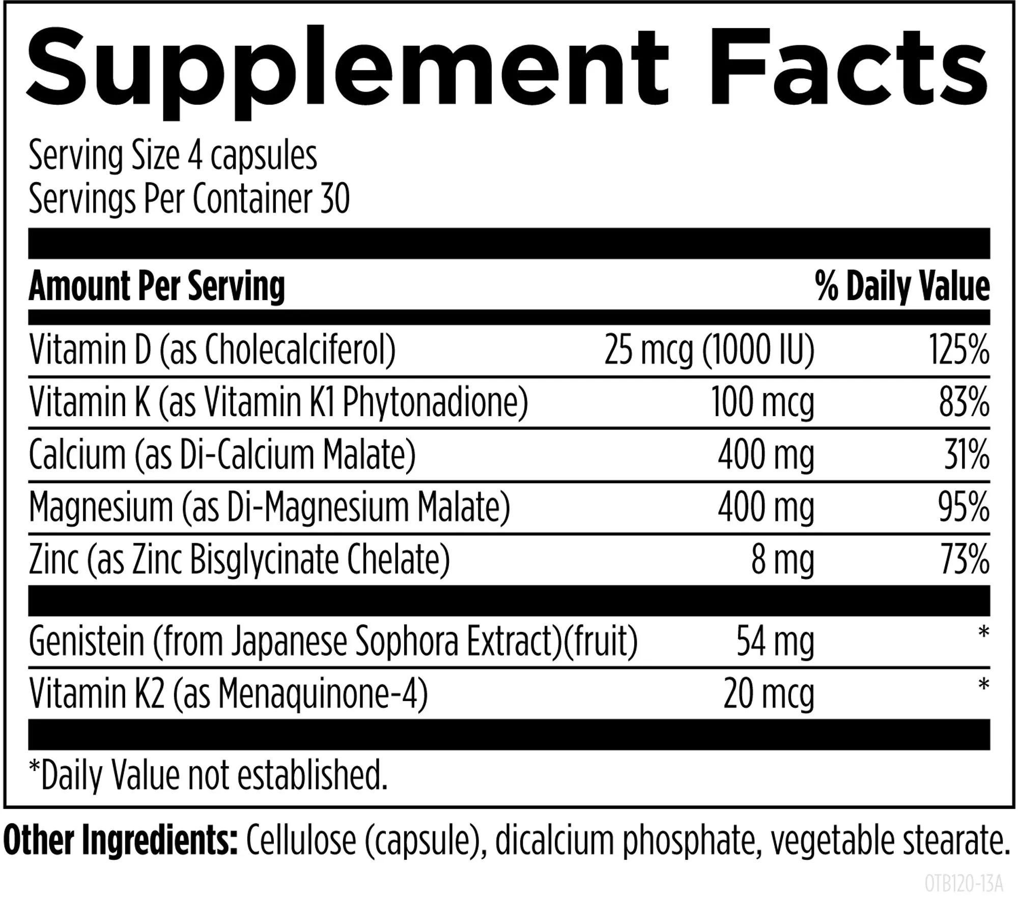 Vitamin D (as Choleciferol), Vitamin K (as Vitamin K1 Phytonadione), Calcium (as Di-Calcium Malate), Magnesium (as Di-Magnesium Malate), Zinc (as Zinc Bisglycinate Chelate), Genistein (from Japanese Sophora Extract)(fruit), Vitamin K2 (as Menaquinone-4), Celulose (capsule), dicalcium phosphate, vegetable stearate.