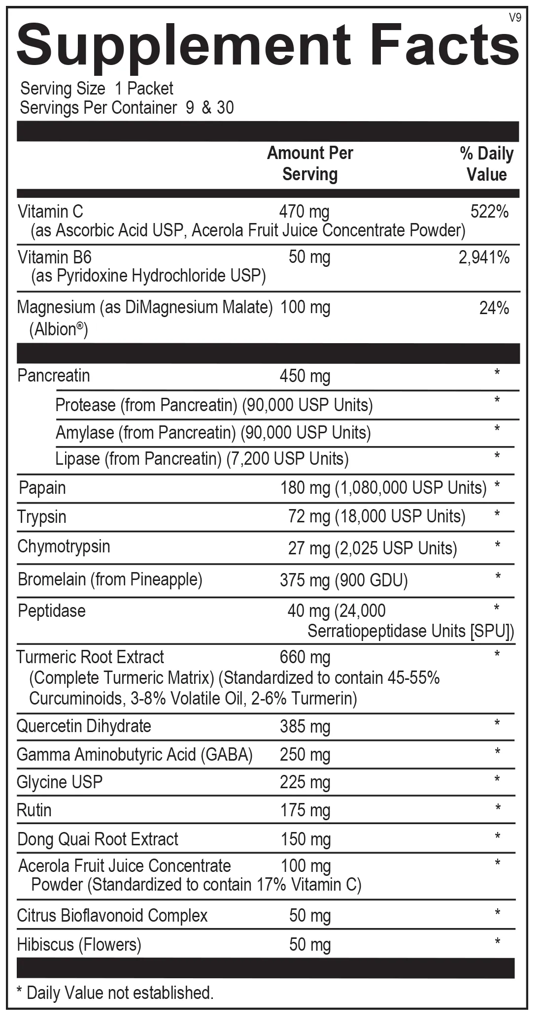 Vitamin C (as Ascorbic Acid USP, Acerola Fruit Juice Concentrate Powder), Vitamin B6 (as Pyridoxine Hydrochloride USP), Magnesium (as DiMagnesium Malate, Albion®), Pancreatin, Protease (from Pancreatin), Amylase (from Pancreatin), Lipase (from Pancreatin), Papain (1,080,000 USP Units), Trypsin (18,000 USP Units), Chymotrypsin (2,025 USP Units), Bromelain (from Pineapple, 900 GDU), Peptidase (24,000 Serratiopeptidase Units [SPU]), Turmeric Root Extract (Complete Turmeric Matrix, Standardized to contain 45-55% Curcuminoids, 3-8% Volatile Oil, 2-6% Turmerin), Quercetin Dihydrate, Gamma Aminobutyric Acid (GABA), Glycine (USP), Rutin, Dong Quai Root Extract, Acerola Fruit Juice Concentrate Powder (Standardized to contain 17% Vitamin C), Citrus Bioflavonoid Complex, Hibiscus (Flowers)