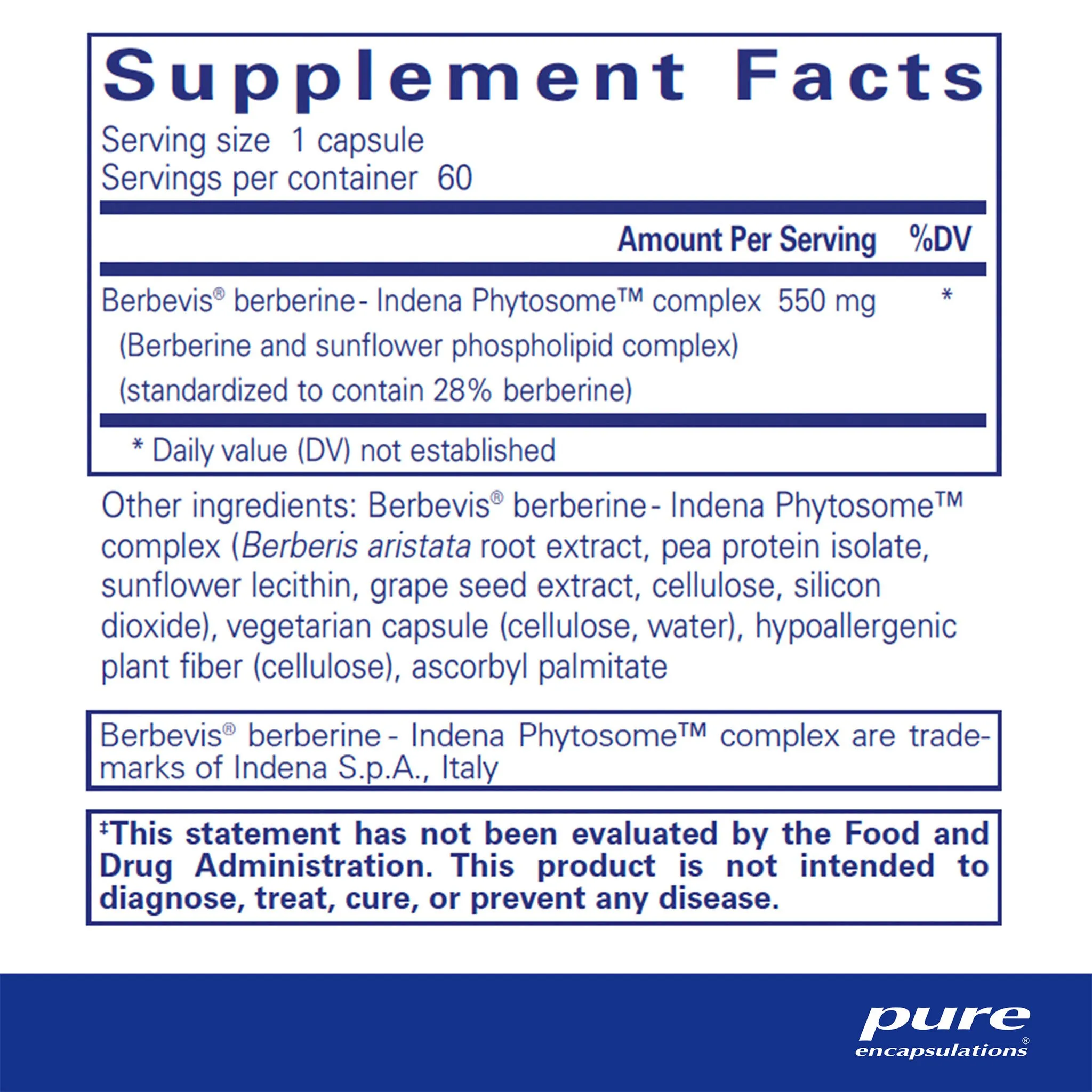 Berbevis® berberine - Indena Phytosome™ complex (Berberine and sunflower phospholipid complex) (standardized to contain 28% berberine), Berbevis® berberine - Indena Phytosome™ complex (Berberis aristata root extract, pea protein isolate, sunflower lecithin, grape seed extract, cellulose, silicon dioxide), vegetarian capsule (cellulose, water), hypoallergenic plant fiber (cellulose), ascorbyl palmitate