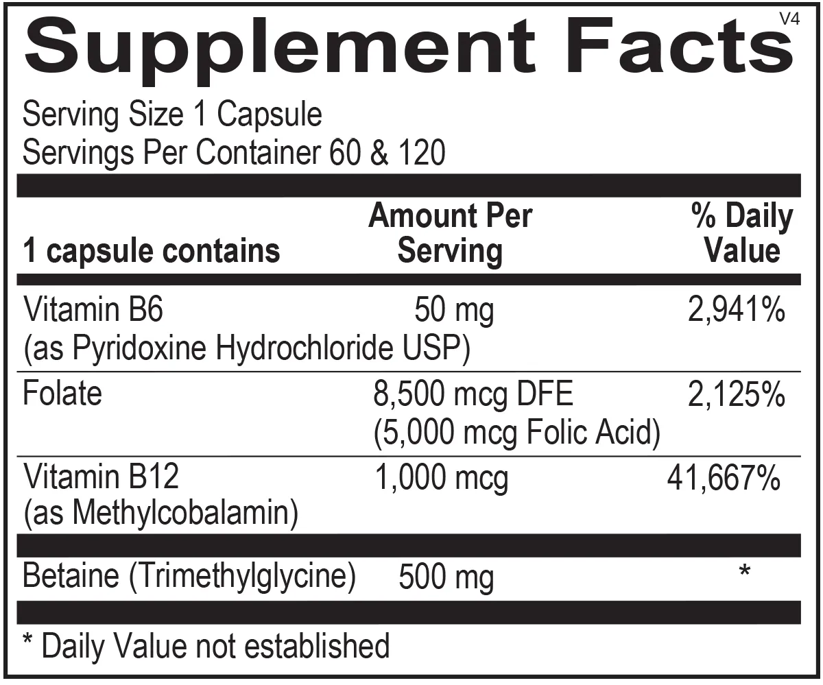 Cardio B contains folic acid, B6, B12, and betaine (trimethylglycine) to support methylation pathways.
