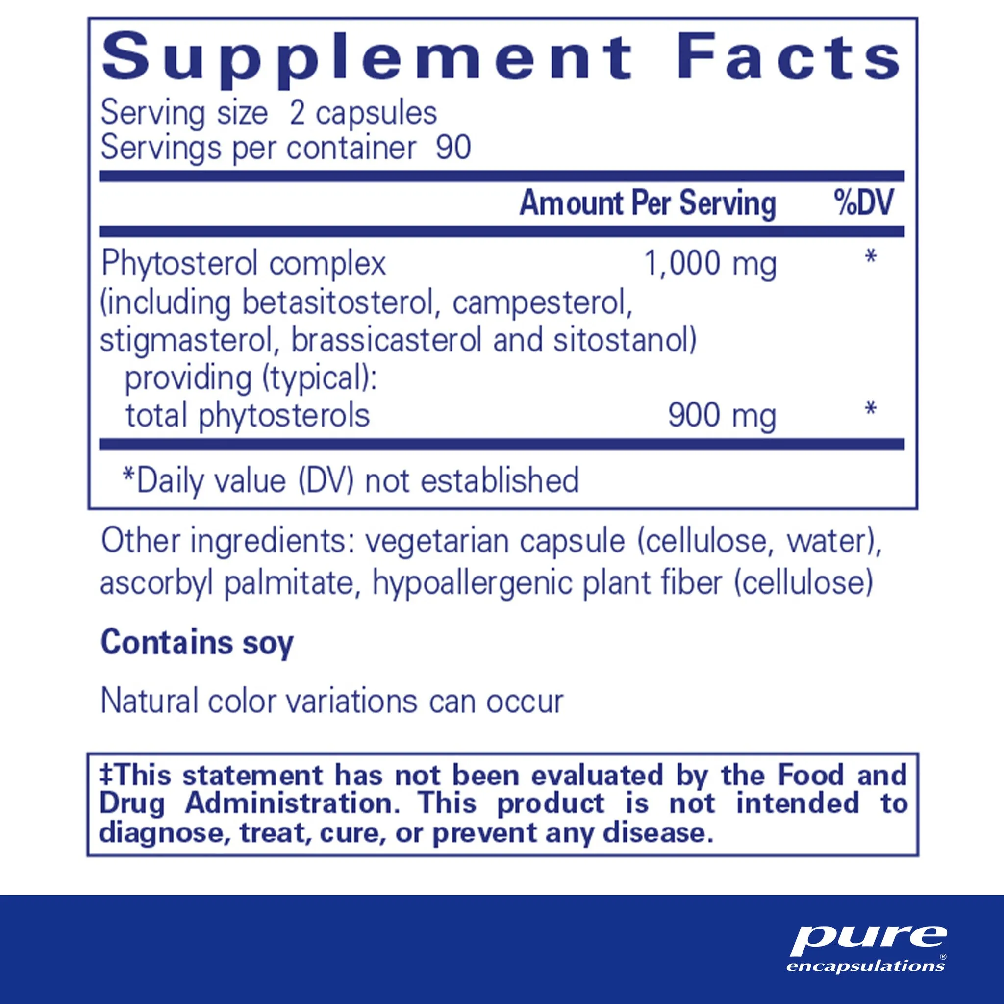 phytosterol complex (including betasitosterol, campesterol, stigmasterol, brassicasterol and sitostanol), total phytosterols, vegetarian capsule (cellulose, water), hypoallergenic plant fiber(cellulose), ascorbyl palmitate