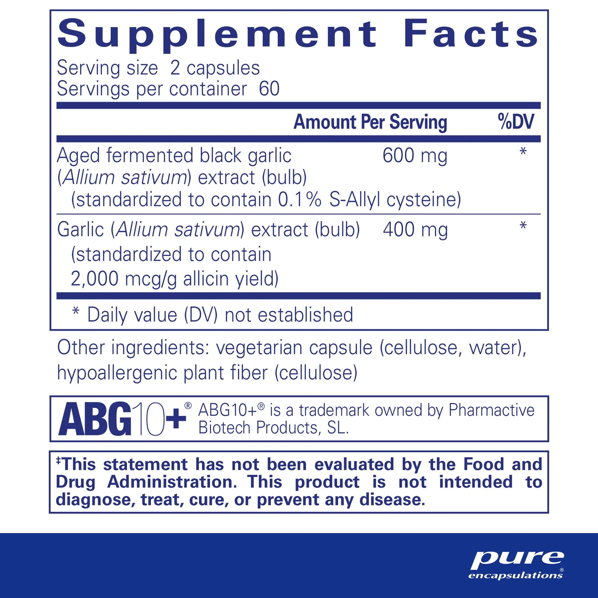 Aged fermented black garlic (Allium sativum) extract (bulb) (standardized to contain 0.1% S-Allyl cysteine), Garlic (Allium sativum) extract (bulb) (standardized to contain 2,000 mcg/g allicin yield), vegetarian capsule (cellulose, water), hypoallergenic plant fiber (cellulose)
