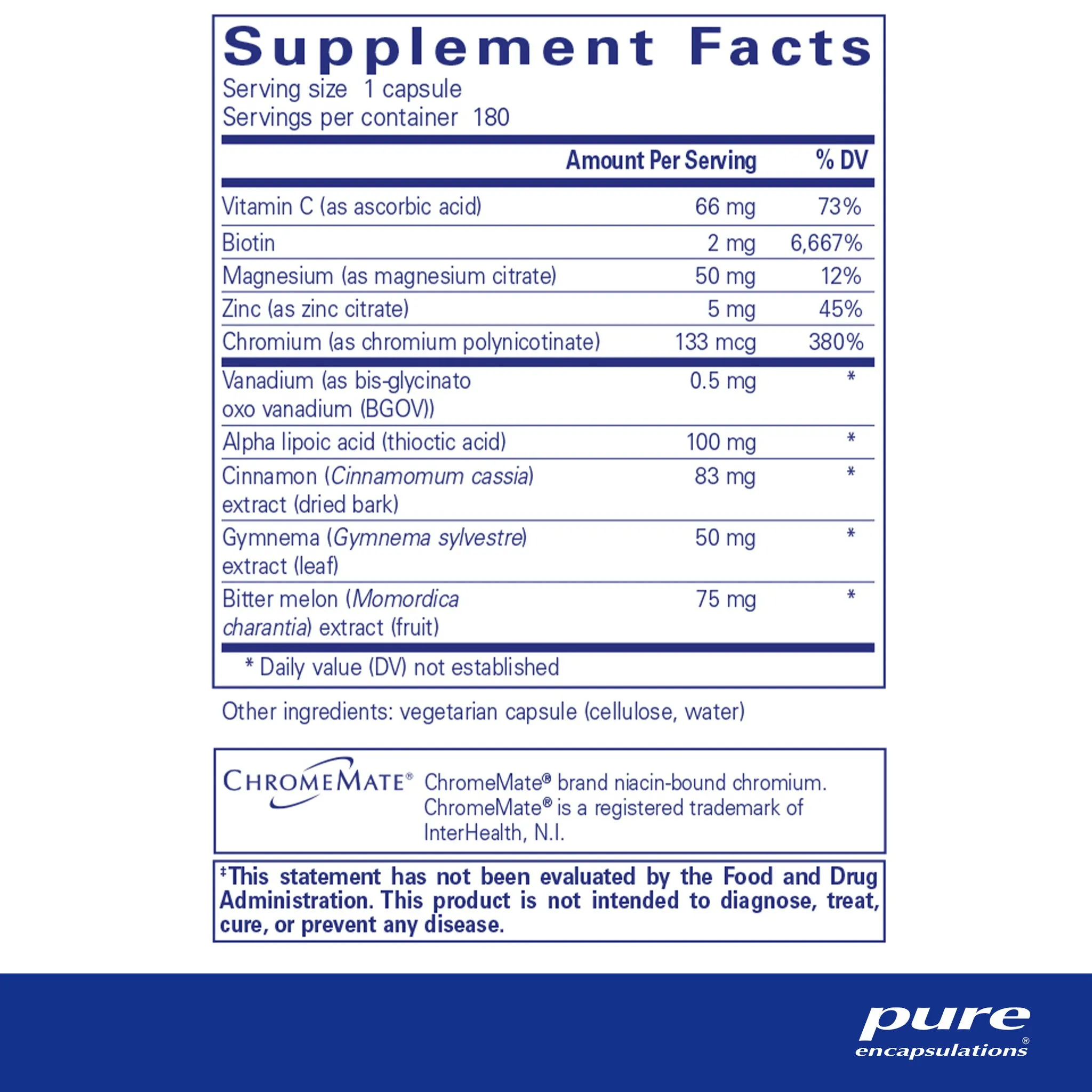 vitamin C (as ascorbic acid), biotin, magnesium (as magnesium citrate), zinc (as zinc citrate), chromium (as chromium polynicotinate), vanadium (as bis-glycinato oxo vanadium (BGOV)), alpha lipoic acid (thioctic acid), cinnamon (Cinnamomum cassia) extract (dried bark), gymnema (Gymnema sylvestre) extract (leaf), bitter melon (Momordica charantia) extract (fruit), vegetarian capsule (cellulose, water) ChromeMate® brand niacin-bound chromium. ChromeMate® is a registered trademark of InterHealth, N.I. CinSulin® is a registered trademark of Tang-An Medical, Ltd.