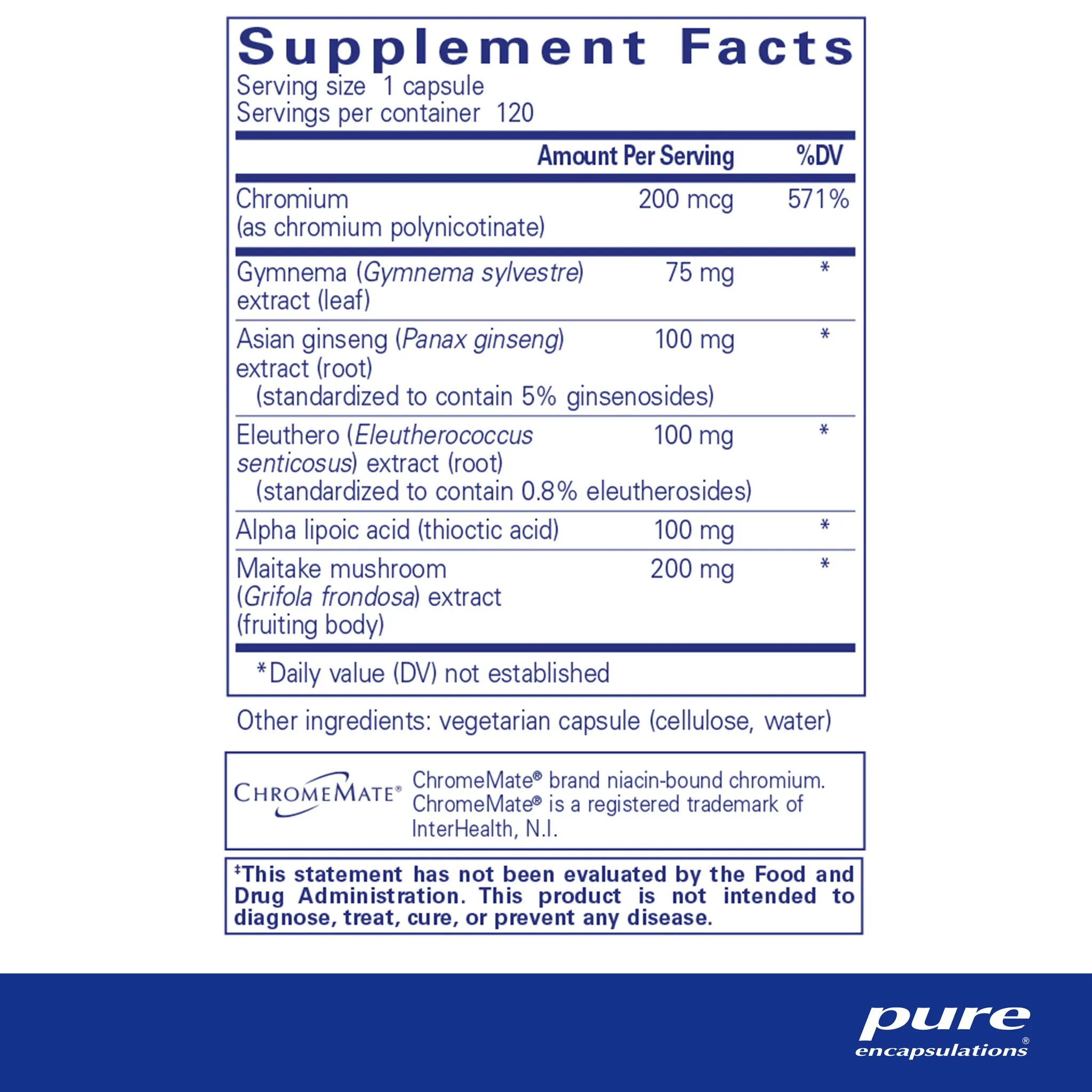 chromium (as chromium polynicotinate), gymnema (Gymnema sylvestre) extract (leaf), Asian ginseng (Panax ginseng) extract (root), eleuthero (Eleutherococcus senticosus) extract (root), alpha lipoic acid (thioctic acid), maitake mushroom (Grifola frondosa) extract (fruiting body), vegetarian capsule (cellulose, water) ChromeMate® brand niacin-bound chromium. ChromeMate® & logo are trademarks of Lonza or its affiliates.