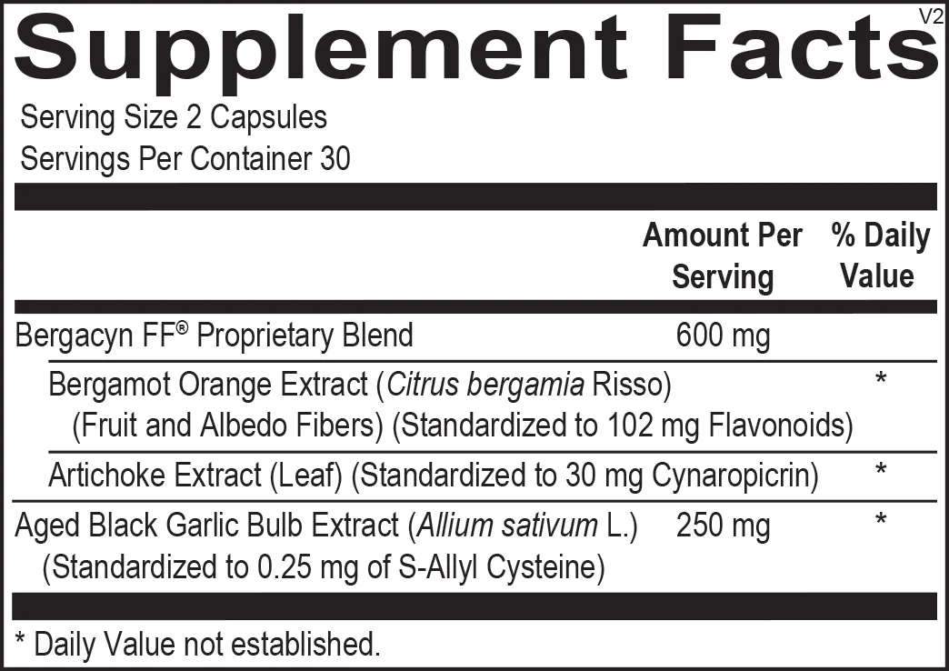 Bergacyn FF® Proprietary Blend (Contains Bergamot Orange Extract (Citrus bergamia Risso) (Fruit and Albedo Fibers) (Standardized to 102 mg Flavonoids) and Artichoke Extract (Leaf) (Standardized to 30 mg Cynaropicrin)), Aged Black Garlic Bulb Extract ((Allium sativum L.) (Standardized to 0.25 mg of S-Allyl Cysteine)), null