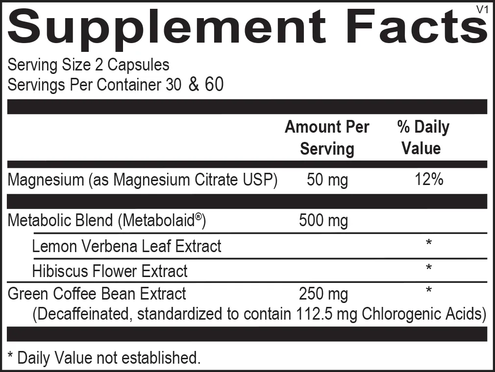 Magnesium (as Magnesium Citrate USP), Metabolic Blend (Metabolaid®) (Lemon Verbena Leaf Extract, Hibiscus Flower Extract), Green Coffee Bean Extract (Decaffeinated, standardized to contain 112.5 mg Chlorogenic Acids)