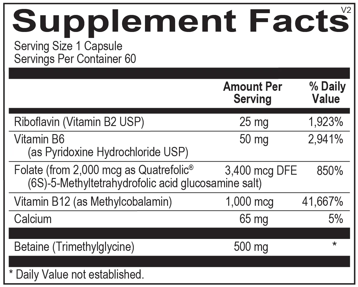 Riboflavin (Vitamin B2 USP), Vitamin B6 (as Pyridoxine Hydrochloride USP), Folate (from 2,000 mcg as Quatrefolic® (6S)-5-Methyltetrahydrofolic acid glucosamine salt), Vitamin B12 (as Methylcobalamin), Calcium, Betaine (Trimethylglycine), null