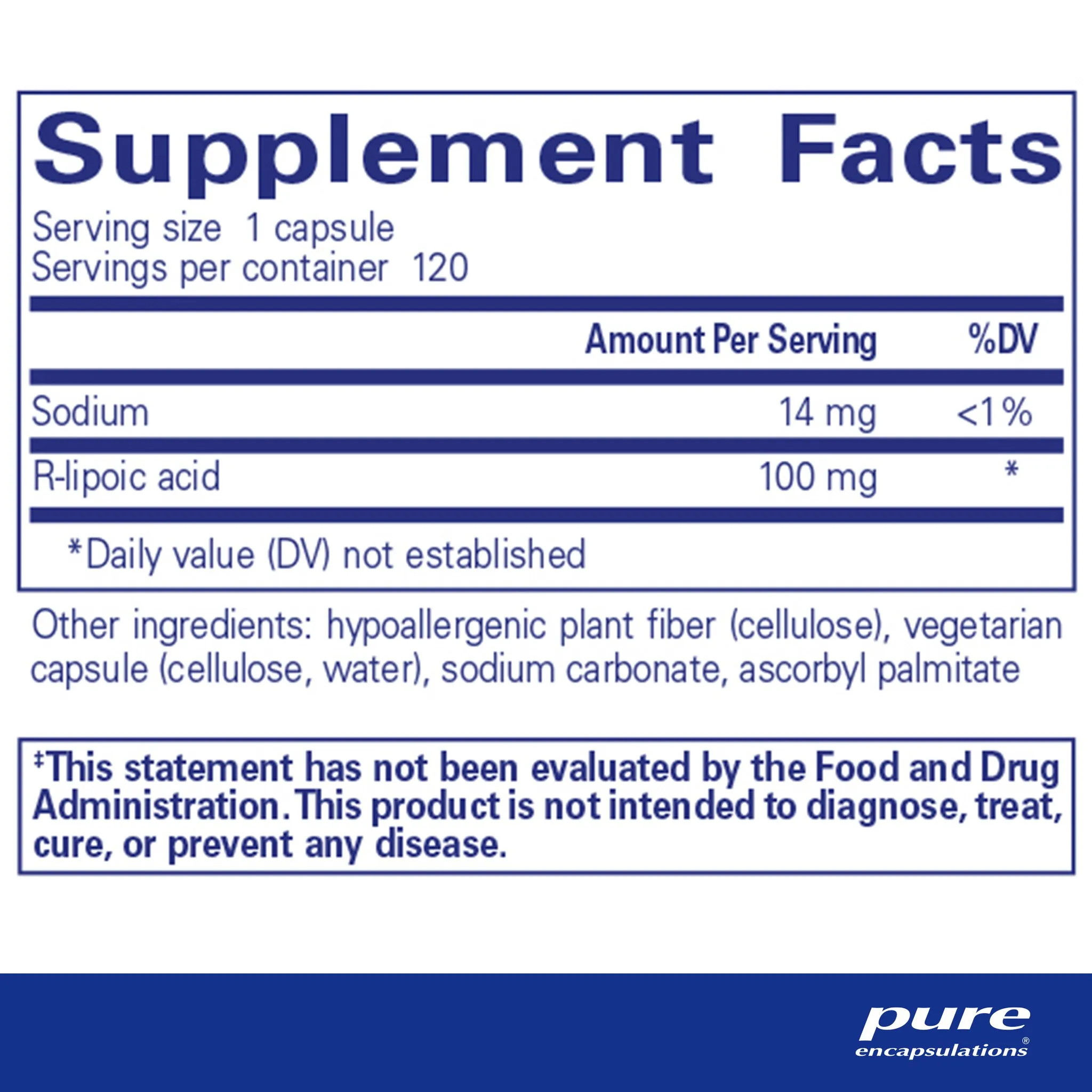 sodium, R-lipoic acid, hypoallergenic plant fiber (cellulose), vegetarian capsule (cellulose, water), sodium carbonate, ascorbyl palmitate
