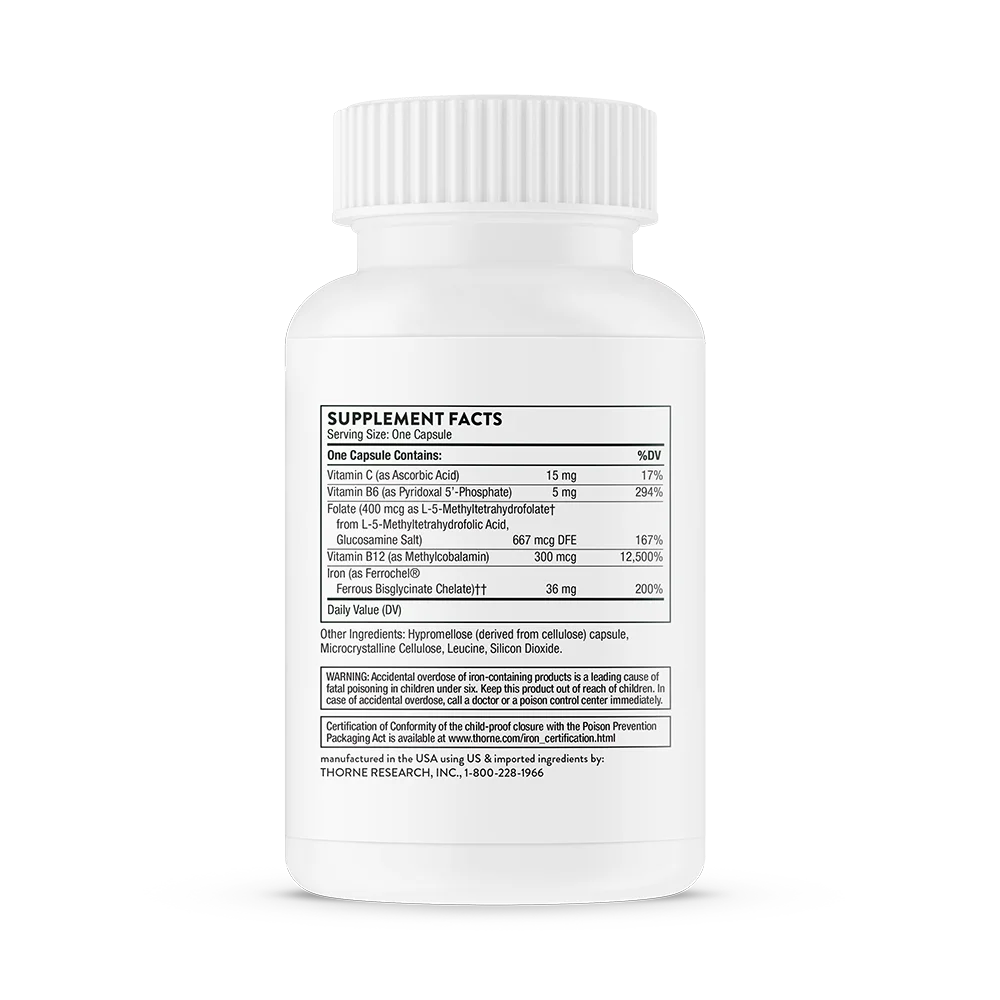 Vitamin C (as Ascorbic Acid), Vitamin B6 (as Pyridoxal 5'-Phosphate), Folate (400 mcg as L-5-Methyltetrahydrofolate from L-5-Methyltetrahydrofolic Acid, Glucosamine Salt ), Vitamin B12 (as Methylcobalamin), Iron (as Ferrochel® Ferrous Bisglycinate Chelate), Hypromellose (derived from cellulose) capsule, Microcrystalline Cellulose, Leucine, Silicon Dioxide.