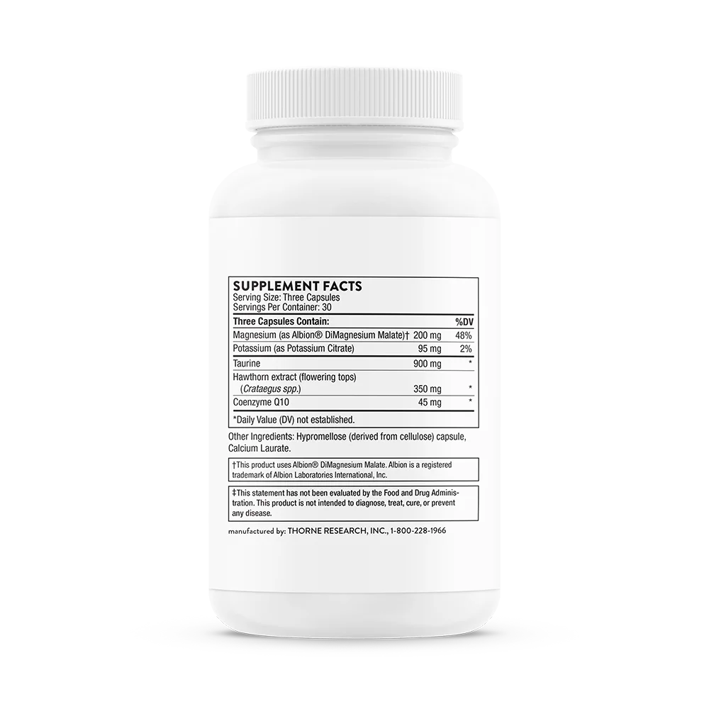 Magnesium (as Albion® DiMagnesium Malate), Potassium (as Potassium Citrate), Taurine, Hawthorn extract (flowering tops) (Crataegus spp.), Coenzyme Q10, Hypromellose (derived from cellulose) capsule, Calcium Laurate.