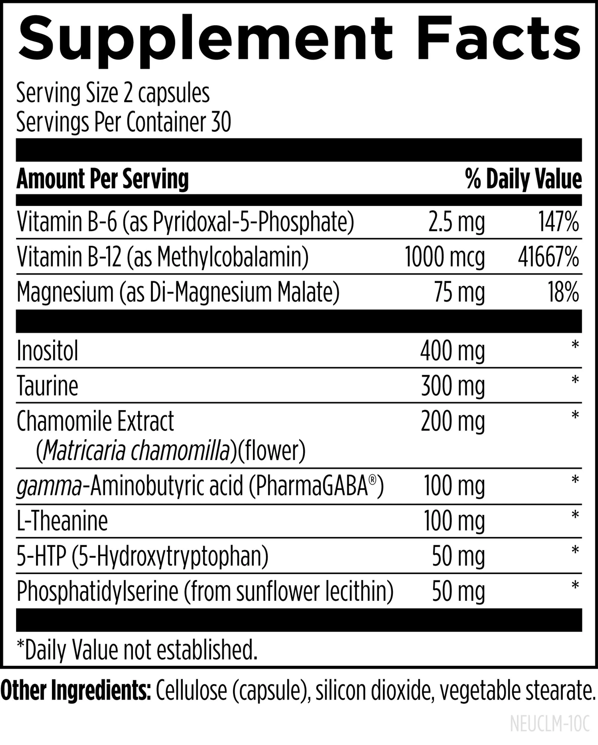 Vitamin B-6 (as Pyridoxal-5-Phosphate), Vitamin B-12 (as Methylcobalamin), Magnesium (as Di-Magnesium Malate), Inositol, Taurine, Chamomile Extract (Matricaria chamomilla)(flower), gamma-Aminobutyric acid (PharmaGABA®), L-Theanine, 5-HTP (5-Hydroxytryptophan), Phosphatidylserine (from sunflower lecithin), Cellulose (capsule), silicon dioxide, vegetable stearate.
