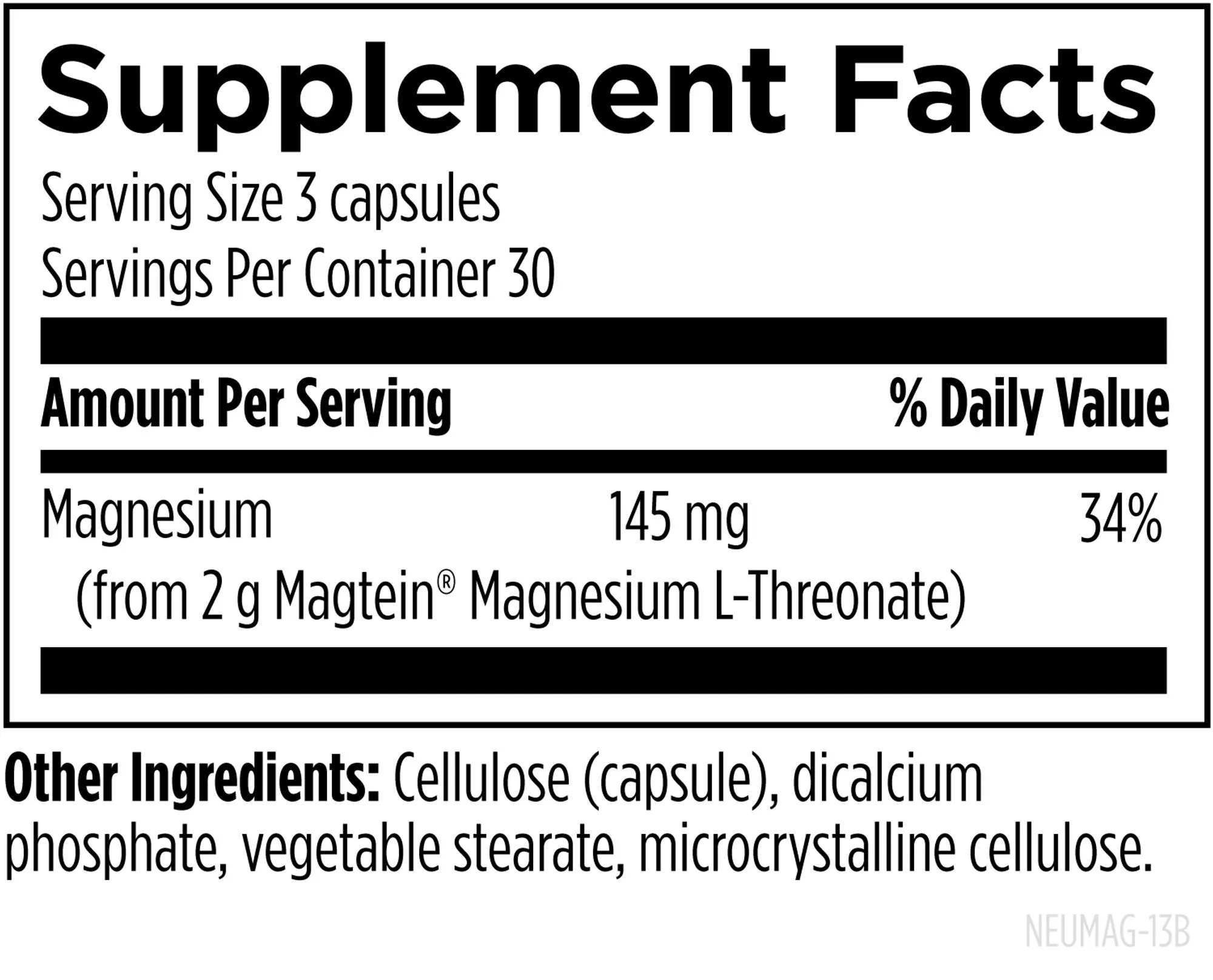 Magnesium (from 2 g Magtein® Magnesium L-Threonate), Cellulose (capsule), dicalcium phosphate, vegetable stearate, microcrystalline cellulose.