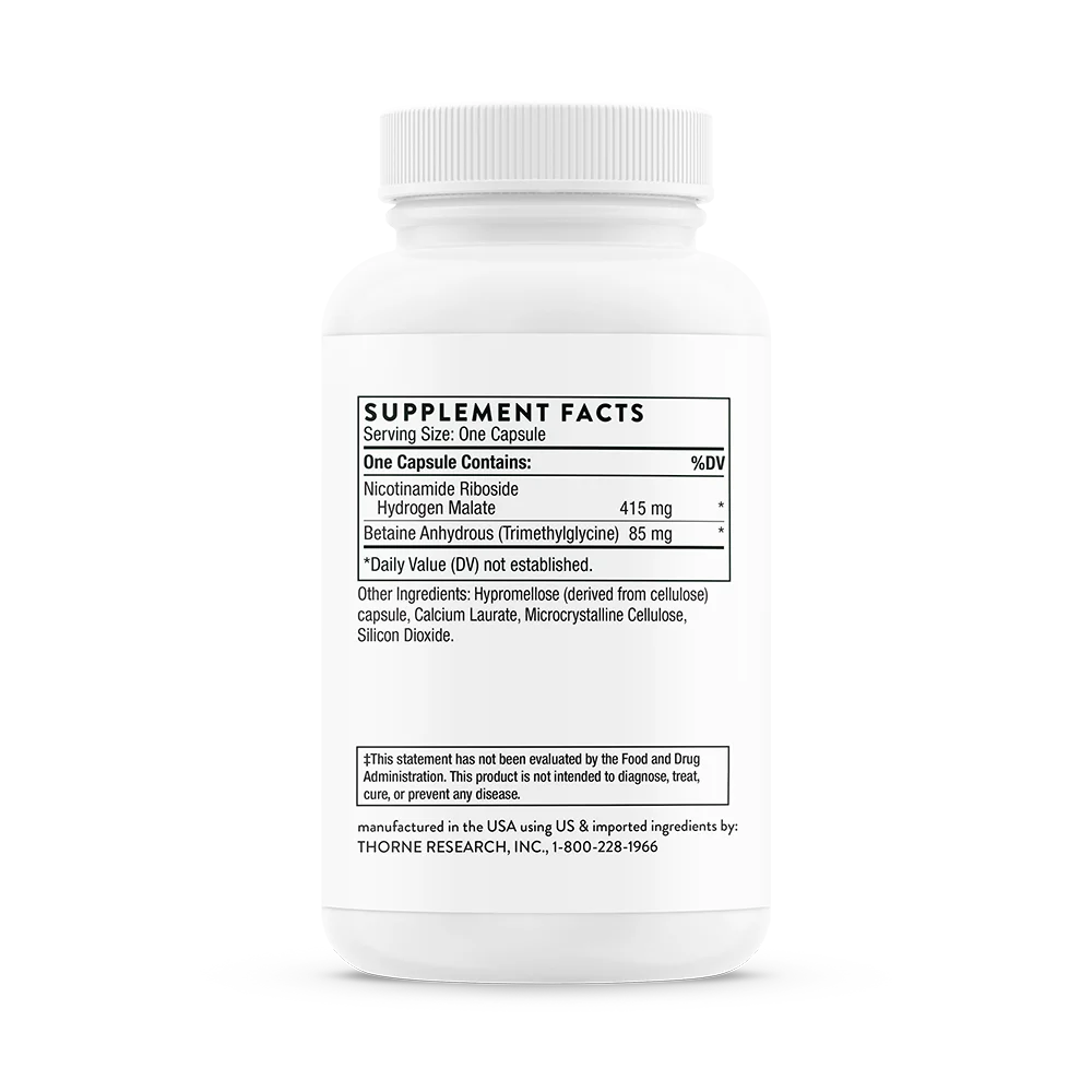 Nicotinamide Riboside Hydrogen Malate, Betaine Anhydrous (Trimethylglycine), Hypromellose (derived from cellulose) capsule, Calcium Laurate, Microcrystalline Cellulose, Silicon Dioxide.