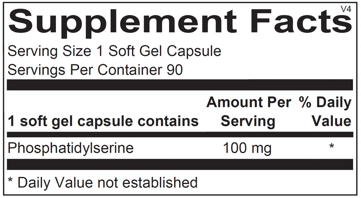 The Phosphatidylserine formula provides 100 mg of purified, high-concentration phosphatidylserine per serving, sourced from sunflower oil.