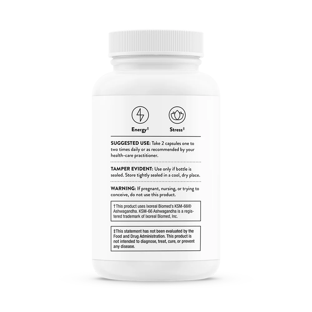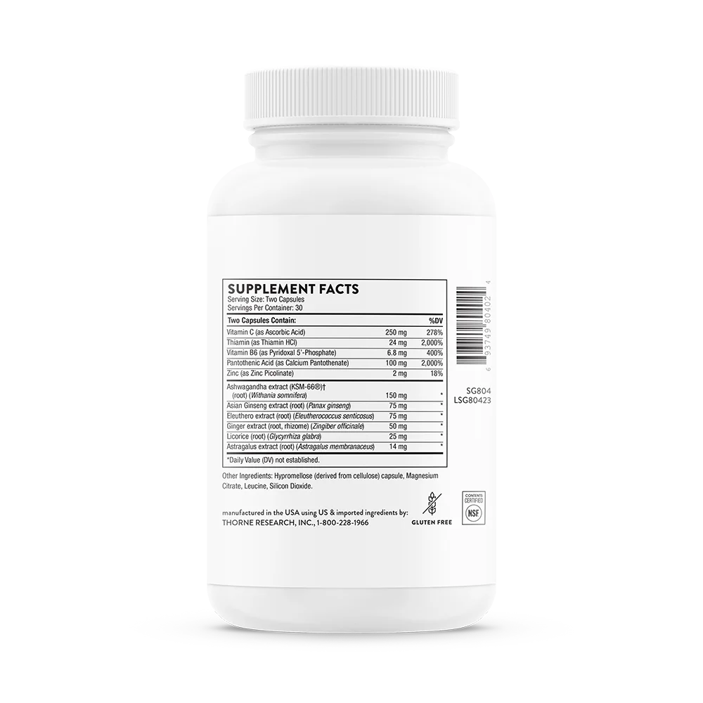 Vitamin C (as Ascorbic Acid), Thiamin (as Thiamin HCl), Vitamin B6 (as Pyridoxal 5'-Phosphate), Pantothenic Acid (as Calcium Pantothenate), Zinc (as Zinc Picolinate), Ashwagandha extract (KSM-66®) (root) (Withania somnifera), Asian Ginseng extract (root) (Panax ginseng), Eleuthero extract (root) (Eleutherococcus senticosus), Ginger extract (root, rhizome) (Zingiber officinale), Licorice (root) (Glycyrrhiza glabra), Astragalus extract (root) (Astragalus membranaceus), Hypromellose (derived from cellulose) capsule, Magnesium Citrate, Leucine, Silicon Dioxide.