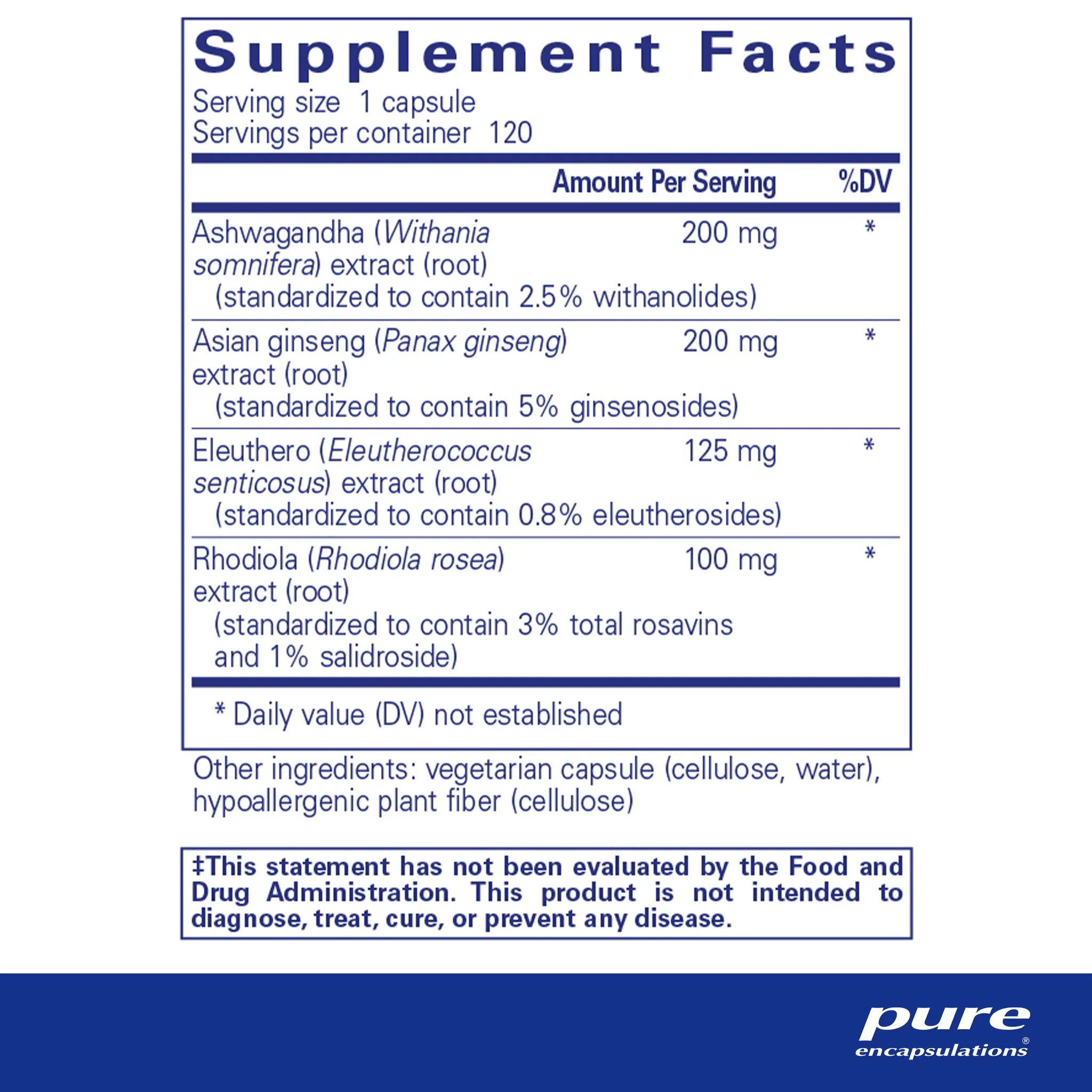 ashwagandha (Withania somnifera) extract (root) (standardized to contain 2.5% withanolides), Asian ginseng (Panax ginseng) extract (root) (standardized to contain 5% ginsenosides), eleuthero (Eleutherococcus senticosus) extract (root) (standardized to contain 0.8% eleutherosides), rhodiola (Rhodiola rosea) extract (root) (standardized to contain 3% total rosavins and 1% salidroside), vegetarian capsule (cellulose, water), hypoallergenic plant fiber (cellulose)
