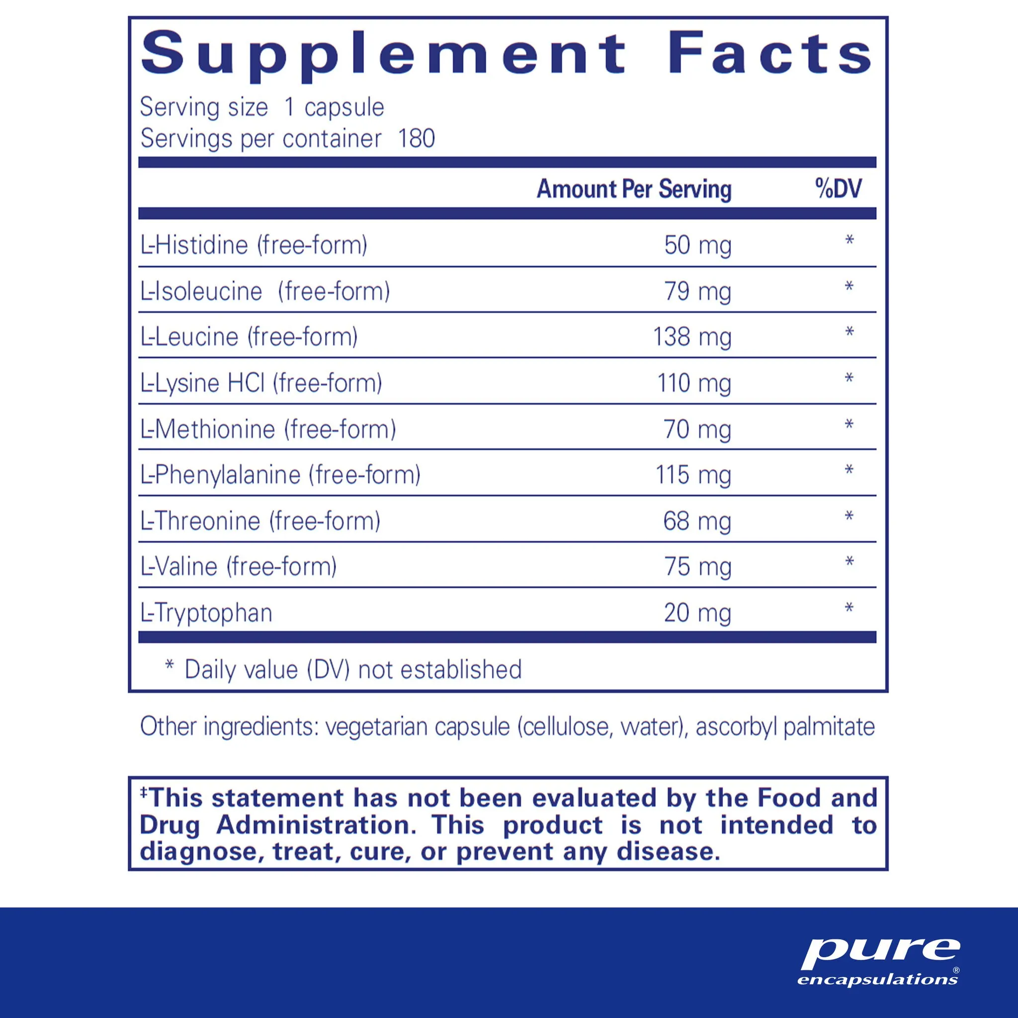 l-histidine (free-form), l-isoleucine (free-form), l-leucine (free-form), l-lysine HCl (free-form), l-methionine (free-form), l-phenylalanine (free-form), l-threonine (free-form), l-valine (free-form), l-tryptophan, vegetarian capsule (cellulose, water), ascorbyl palmitate