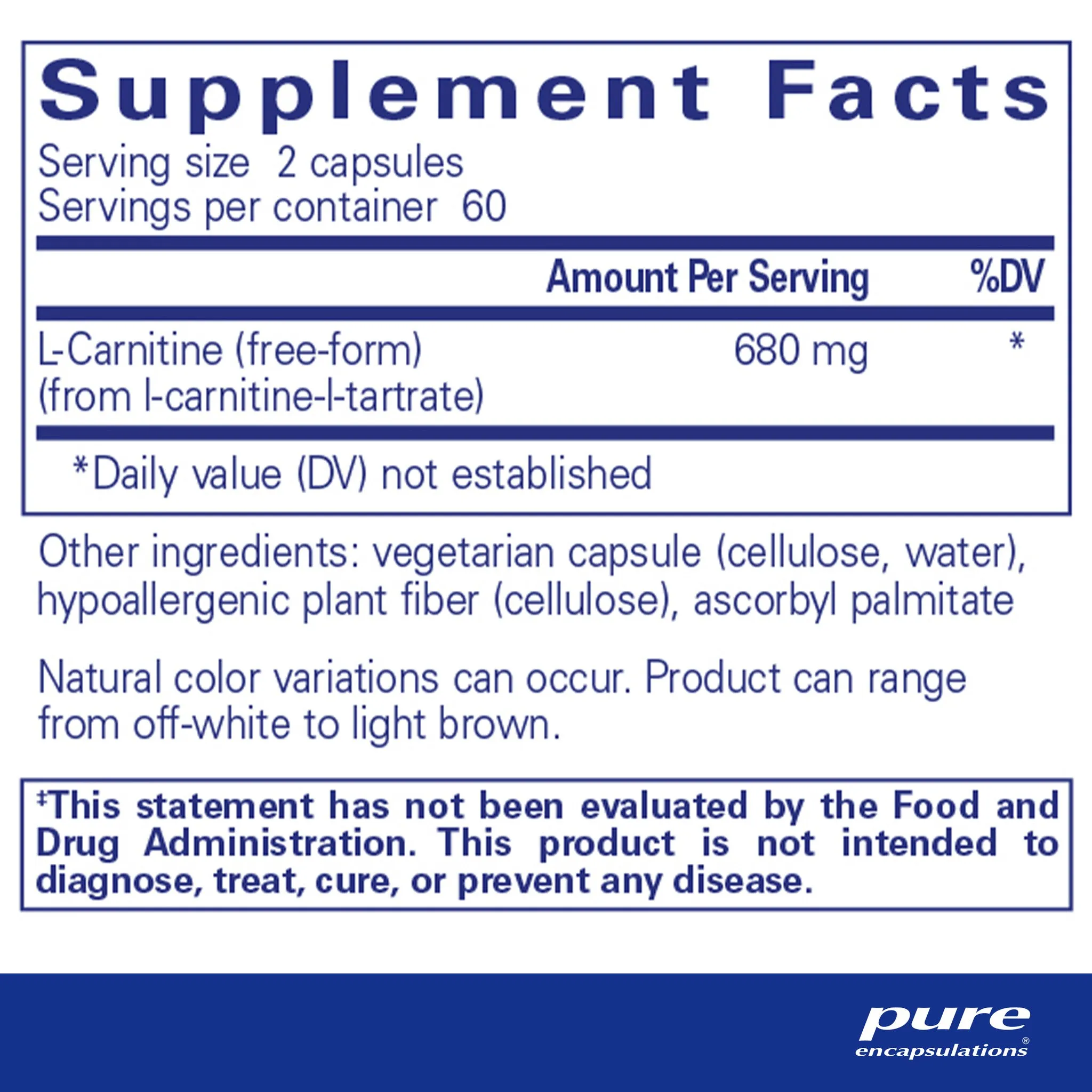 l-carnitine (free-form) (from l-carnitine-l-tartrate), vegetarian capsule (cellulose, water), hypoallergenic plant fiber (cellulose), ascorbyl palmitate