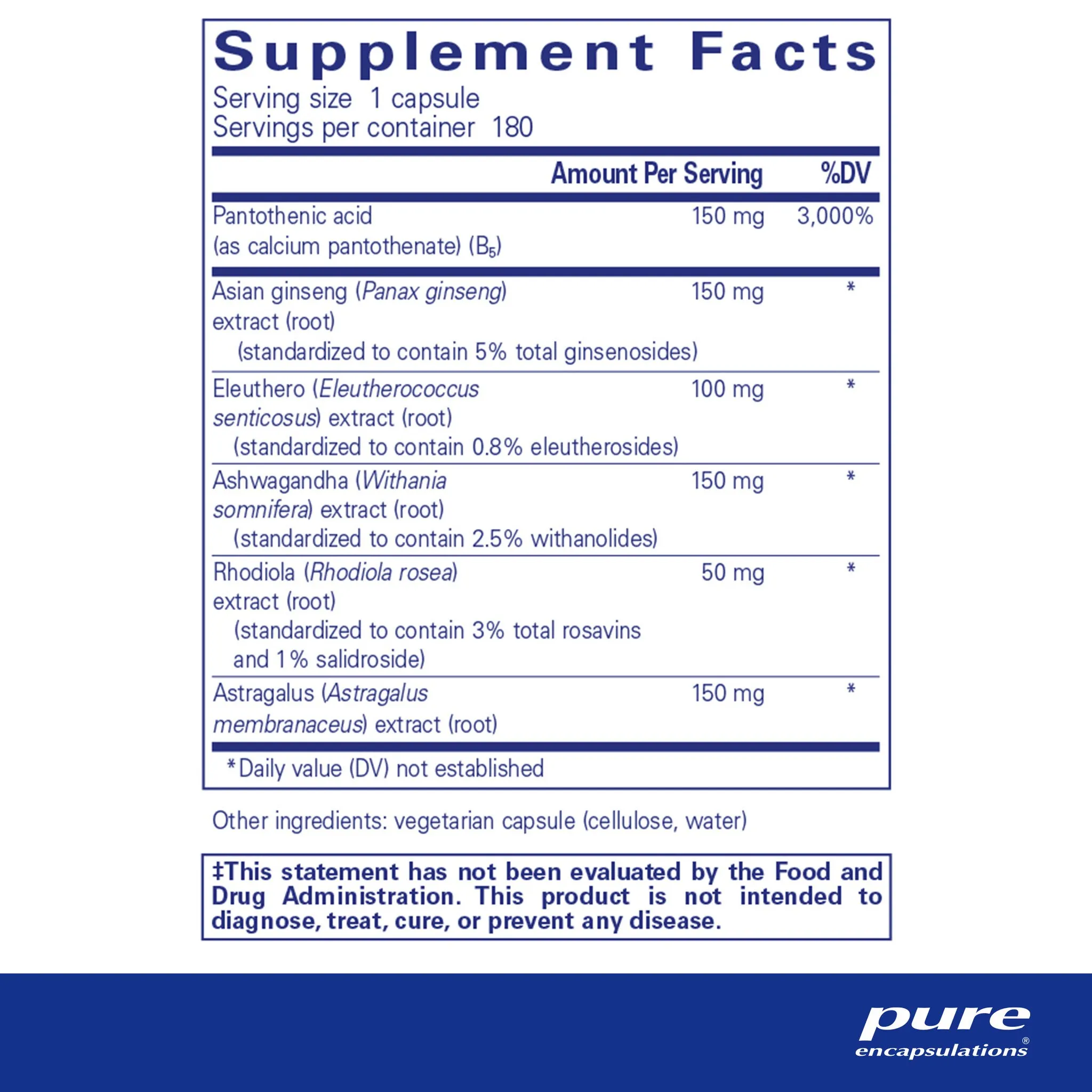 pantothenic acid (as calcium pantothenate)(B5), asian ginseng (Panax ginseng) extract (root), eleuthero (Eleutherococcus senticosus) extract (root), ashwagandha (Withania somnifera) extract (root), rhodiola (Rhodiola rosea) extract (root), astragalus (Astragalus membranaceus) extract (root), vegetarian capsule (cellulose, water)