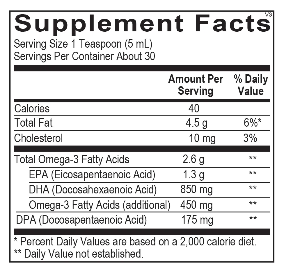 Calories, Total Fat, Cholesterol, Total Omega-3 Fatty Acids, EPA (Eicosapentaenoic Acid), DHA (Docosahexaenoic Acid), Omega-3 Fatty Acids (additional), DPA (Docosapentaenoic Acid), null