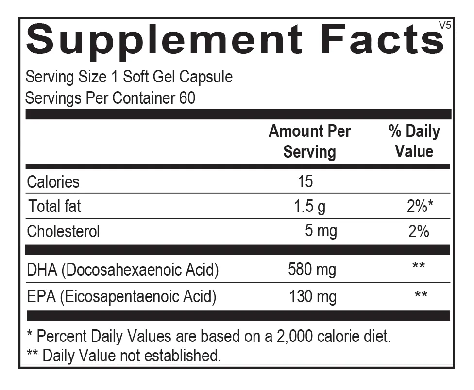 High-concentration DHA fish oil formula providing 580 mg of DHA per soft gel.