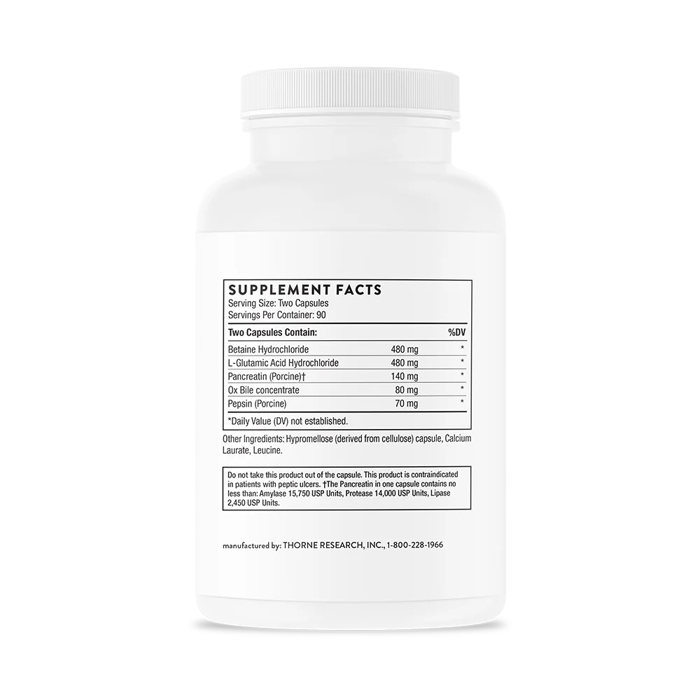 Betaine Hydrochloride, L-Glutamic Acid Hydrochloride, Pancreatin (Porcine), Ox Bile concentrate, Pepsin (Porcine), Hypromellose (derived from cellulose) capsule, Calcium Laurate, Leucine. Do not take this product out of the capsule. This product is contraindicated in patients with peptic ulcers. †The Pancreatin in one capsule contains no less than: Amylase 15,750 USP Units, Protease 14,000 USP Units, Lipase 2,450 USP Units.