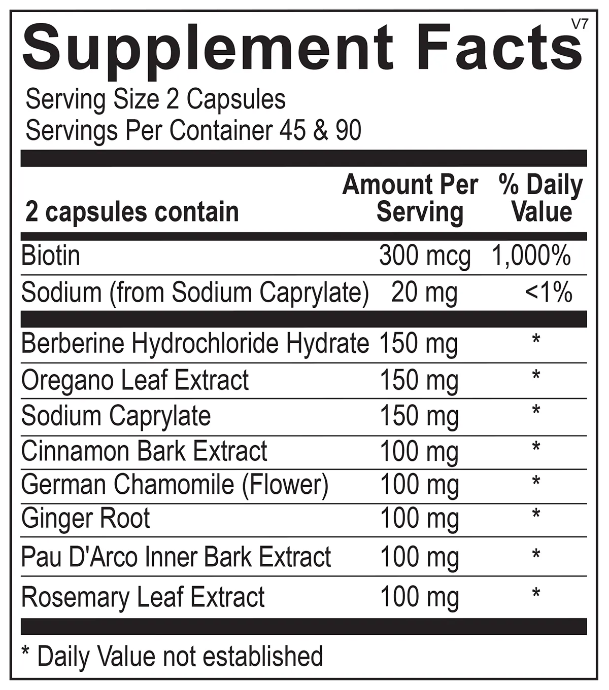 Biotin, Sodium (from Sodium Caprylate), Berberine Hydrochloride Hydrate, Oregano Leaf Extract, Sodium Caprylate, Cinnamon Bark Extract, German Chamomile (Flower), Ginger Root, Pau D'Arco Inner Bark Extract, Rosemary Leaf Extract