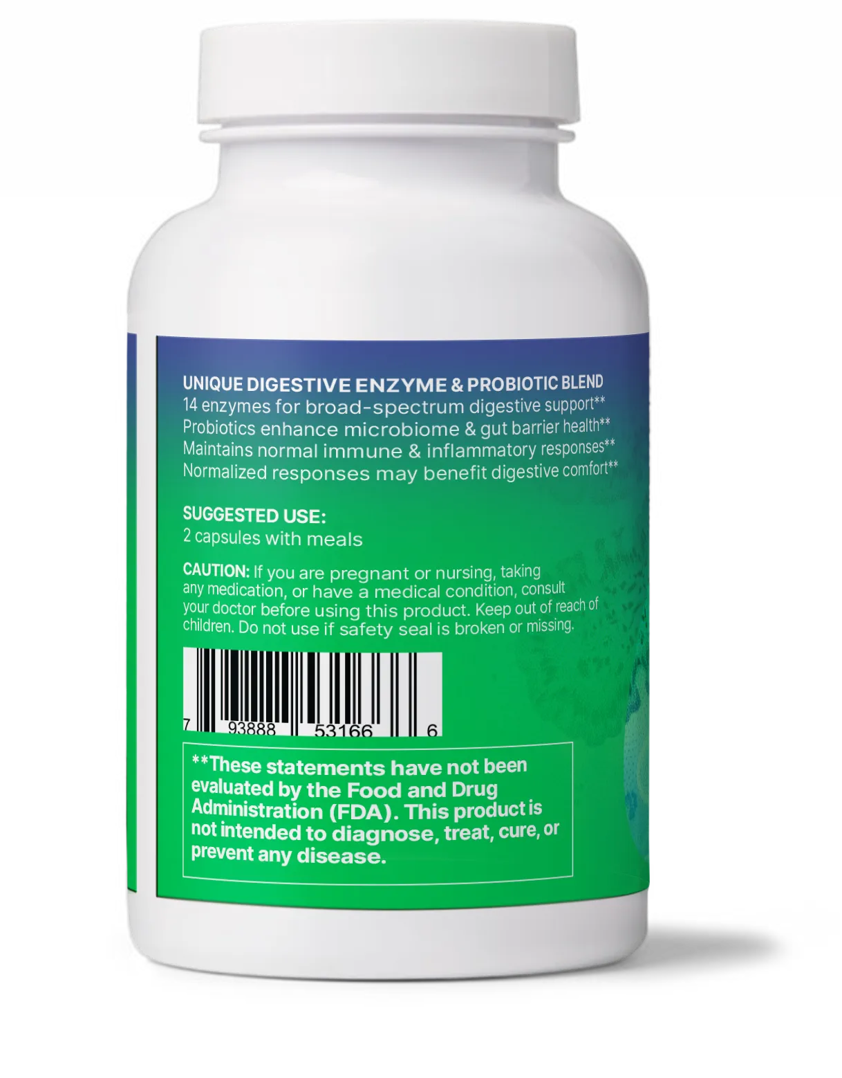 Proprietary Enzyme Blend, Amylase, Protease, Glucoamylase, Alpha-Galactosidase, Cellulase, Lipase, Lactase, Maltase, Xylanase, Invertase, Pectinase, Hemicellulase, Acid Stable Protease, Peptidase, Proprietary Probiotic Blend, Bacillus subtilis, HU58, Bacillus coagulans (SC-208), Saccharomyces boulardii (CNCM-I-1079), Vegetable capsule (hypromellose, water), microcrystalline cellulose, magnesium stearate, silicon dioxide.