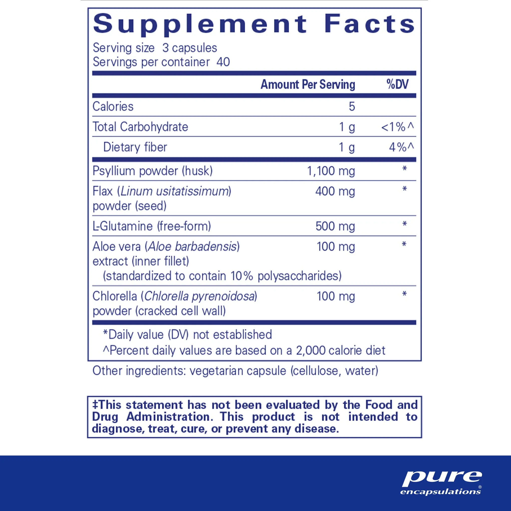 psyllium powder (husk), flax (Linum usitatissimum) powder (seed), l-glutamine (free-form), aloe vera (Aloe barbadensis) extract (inner fillet), chlorella (Chlorella spp.) powder (cracked cell wall), vegetarian capsule (cellulose, water)