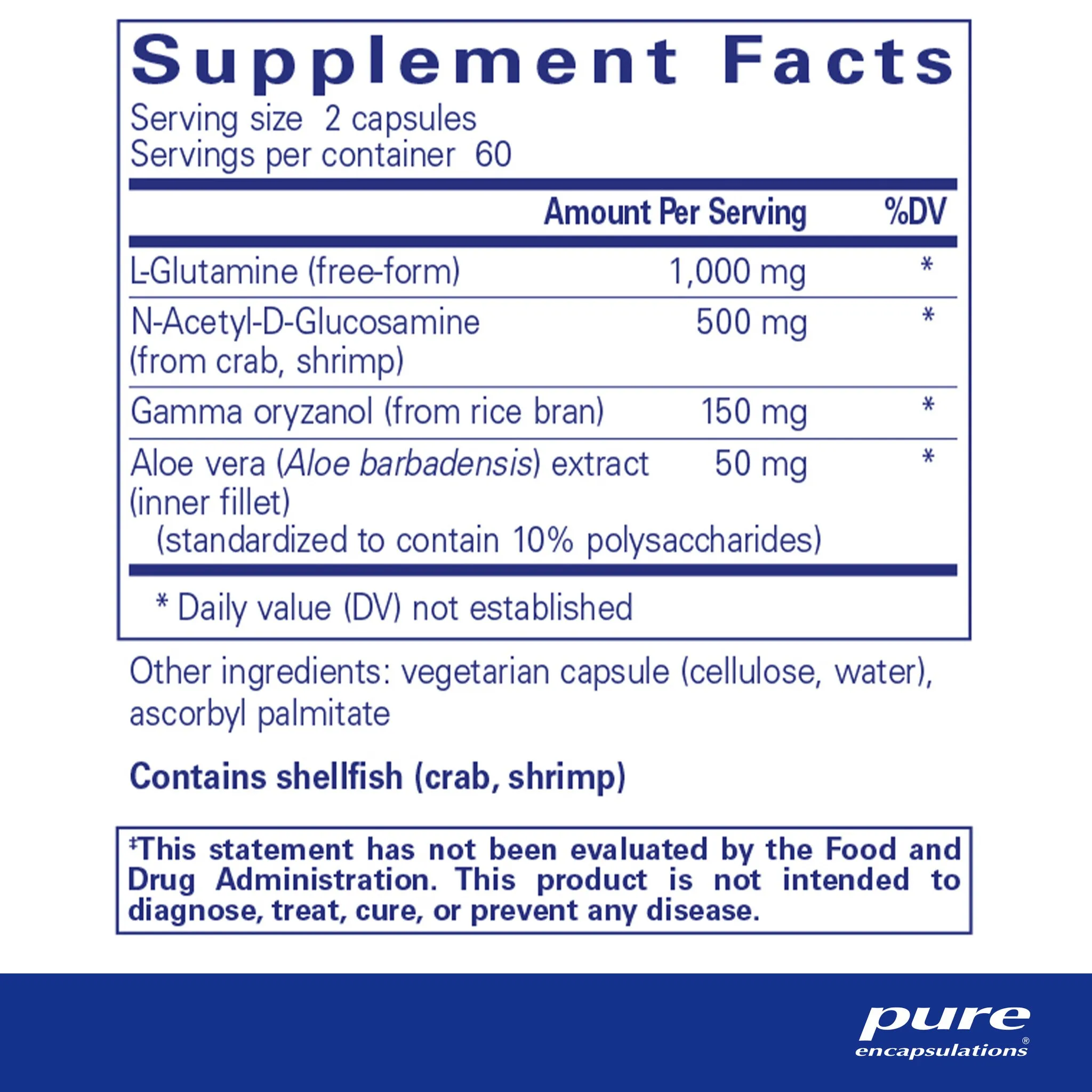 l-glutamine (free-form), n-acetyl-d-glucosamine (from crab, shrimp), gamma oryzanol (from rice bran), aloe vera (Aloe barbadensis) extract (inner fillet), vegetarian capsule (cellulose, water), ascorbyl palmitate