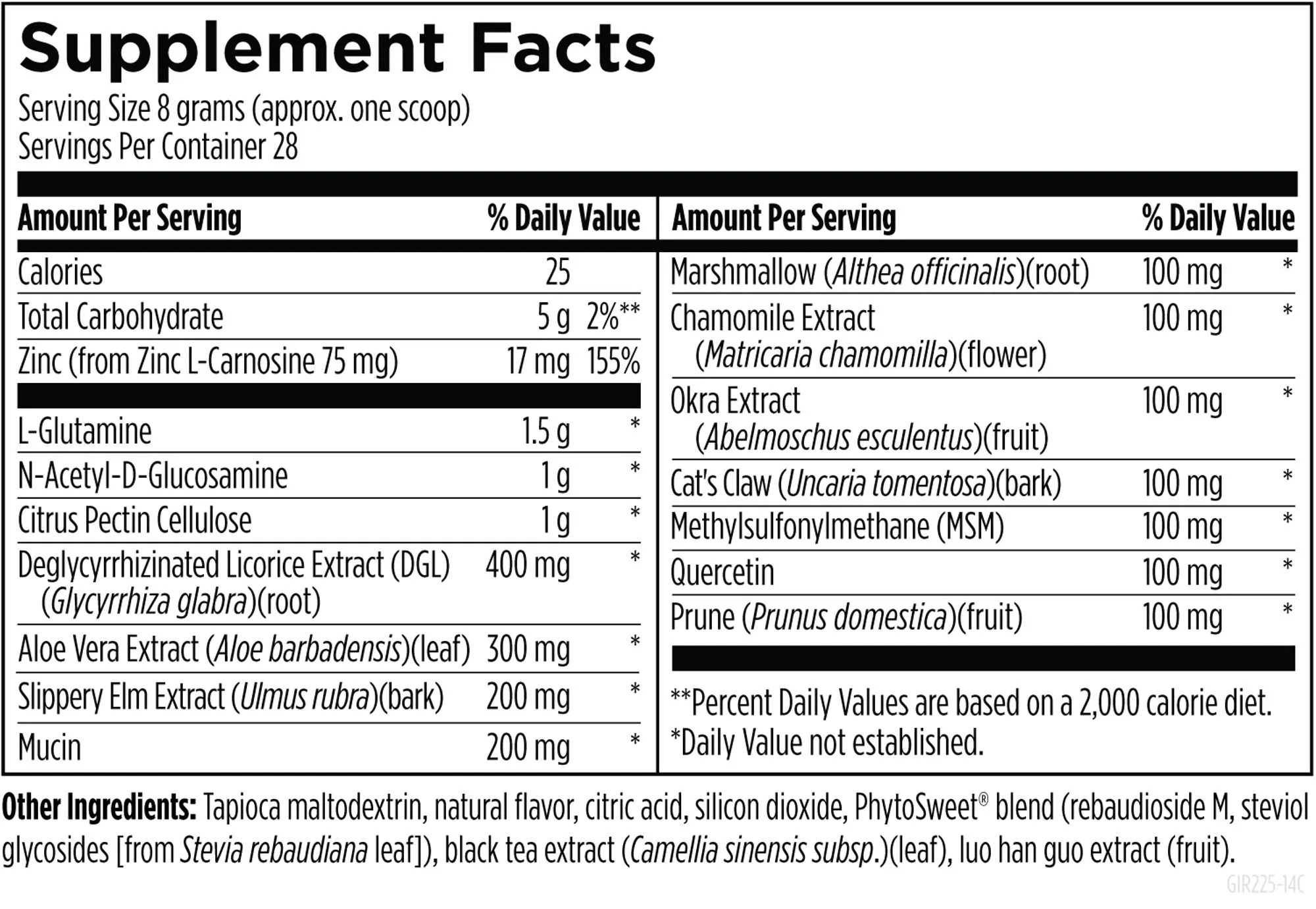 Calories, Total Carbohydrate, Zinc (from Zinc L-Carnosine 75 mg), L-Glutamine, N-Acetyl-D-Glucosamine, Citrus Pectin Cellulose, Deglycyrrhizinated Licorice Extract (DGL) (Glycyrrhiza glabra)(root), Aloe Vera Extract (Aloe barbadensis)(leaf), Slippery Elm Extract (Ulmus rubra)(bark), Mucin, Marshmallow (Althea officinalis)(root), Chamomile Extract (Matricaria chamomilla)(flower), Okra Extract (Abelmoschus esculentus)(fruit), Cat's Claw (Uncaria tomentosa)(bark), Methylsulfonylmethane (MSM), Quercetin, Prune (Prunus domestica)(fruit), Tapioca maltodextrin, natural flavor, citric acid, silicon dioxide, PhytoSweet® blend (rebaudioside M, steviol glycosides [from Stevia rebaudiana leaf]), black tea extract (Camellia sinensis subsp.)(leaf), luo han guo extract (fruit).
