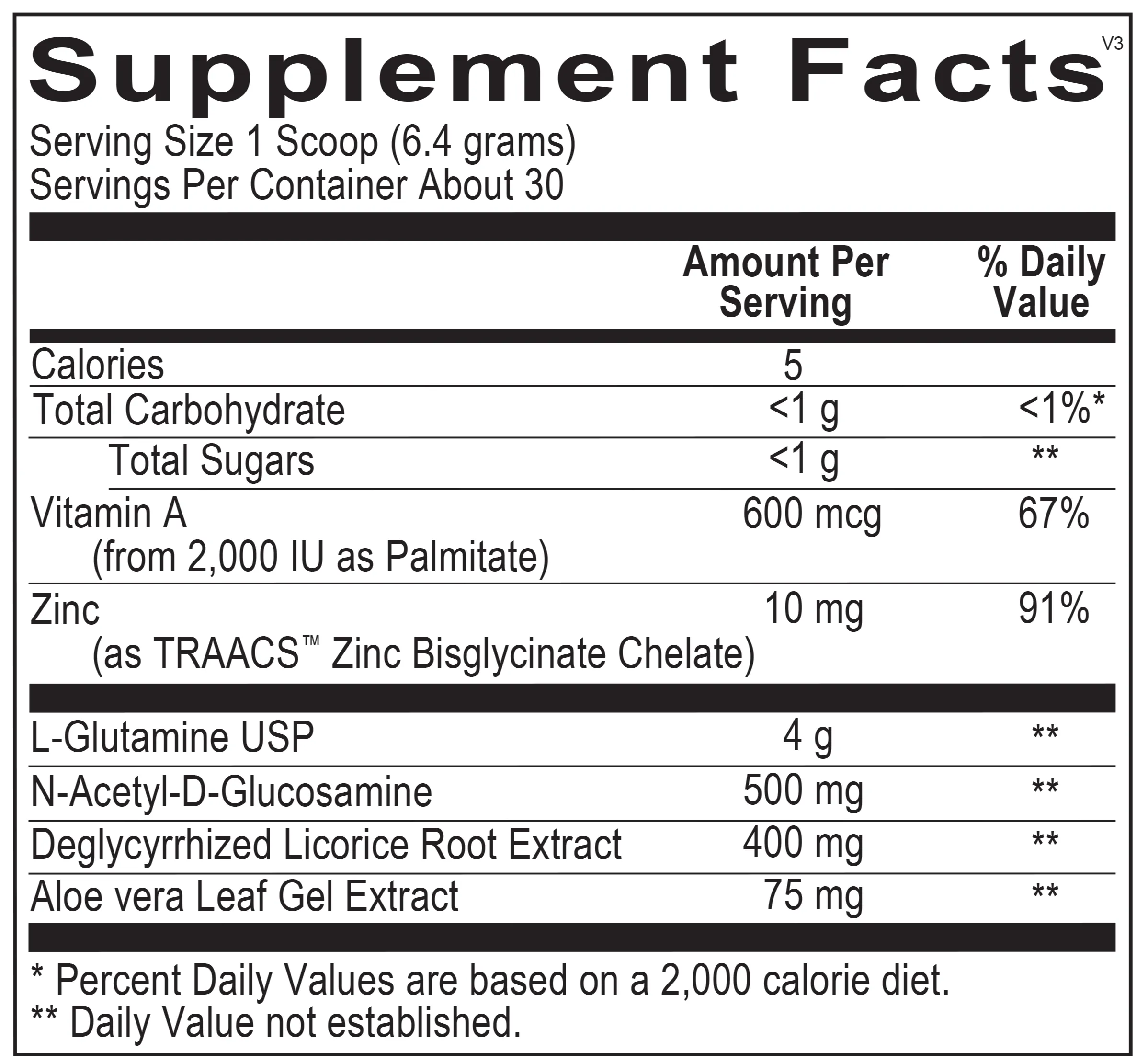 Vitamin A (from 2,000 IU as Palmitate), Zinc (as TRAACS™ Zinc Bisglycinate Chelate), L-Glutamine USP, N-Acetyl-D-Glucosamine, Deglycyrrhized Licorice Root Extract, Aloe vera Leaf Gel Extract