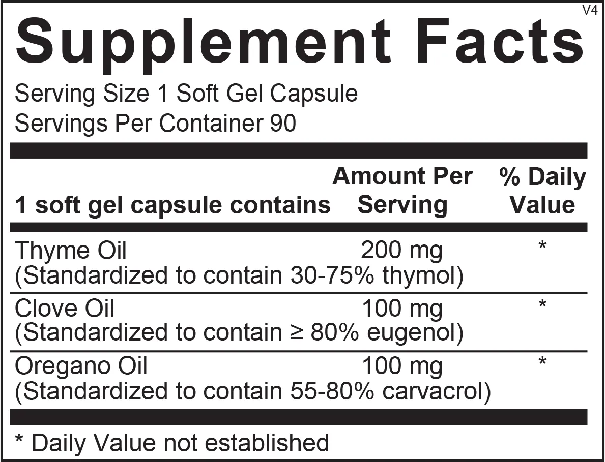 Thyme Oil (Standardized to contain 30-75% thymol), Clove Oil (Standardized to contain ≥ 80% eugenol), Oregano Oil (Standardized to contain 55-80% carvacrol)