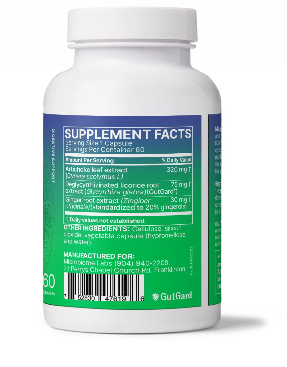 Artichoke leaf extract (Cynara scolymus L), Deglycyrrhizinated licorice root extract (Glycyrrhiza glabra) (GutGard), Ginger root extract (Zingiber officinale) (standardized to 20% gingerols), Cellulose, silicon dioxide, vegetable capsule (hypromellose and water)