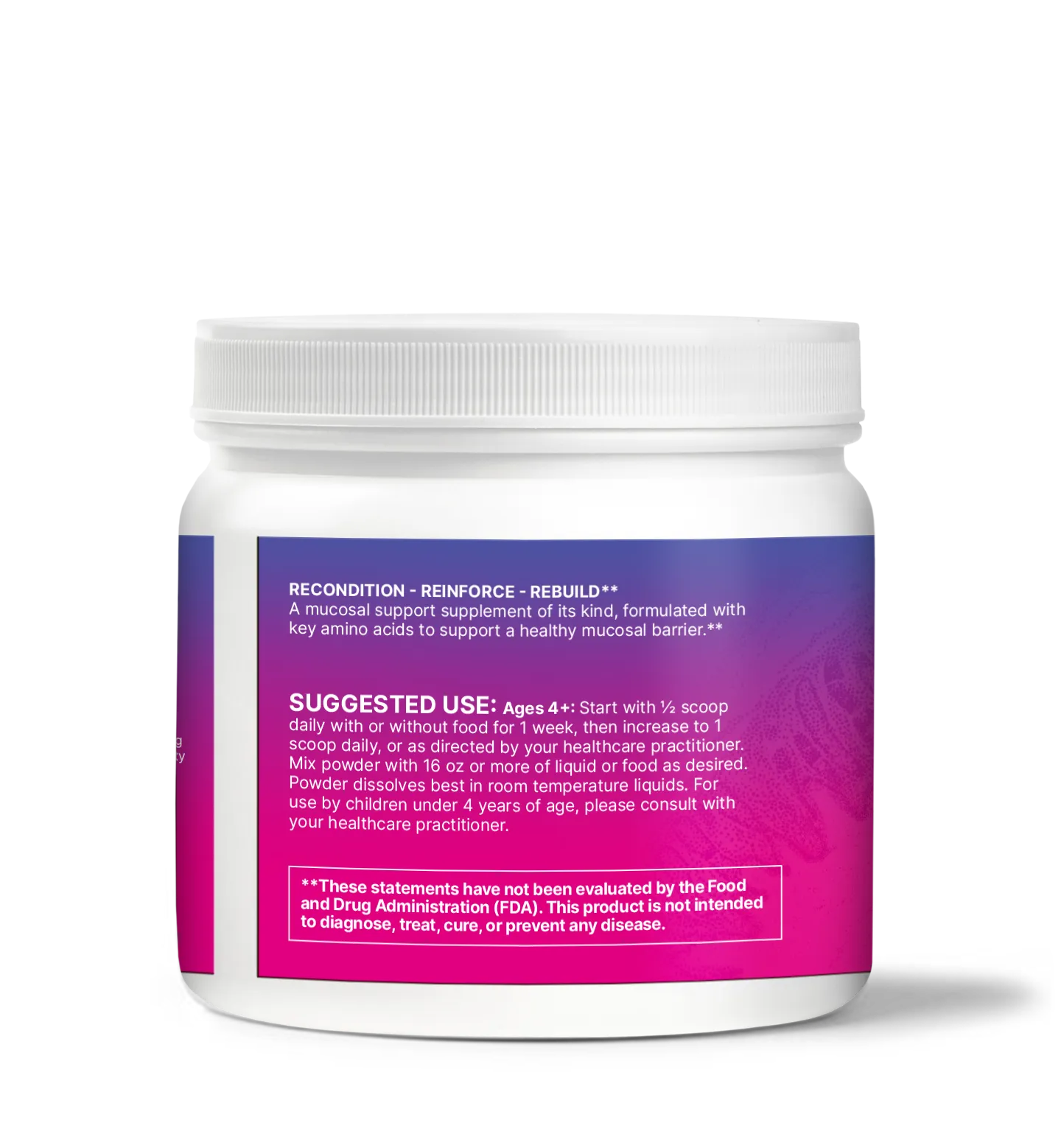 Ages 4+: Week 1: 1/2 scoop per day. Week 2+: 1 scoop per day. Mix into 16 oz of water, liquid, or food. Powder dissolves best at room temperature. For use by children under 4 years of age, please consult with your healthcare practitioner.