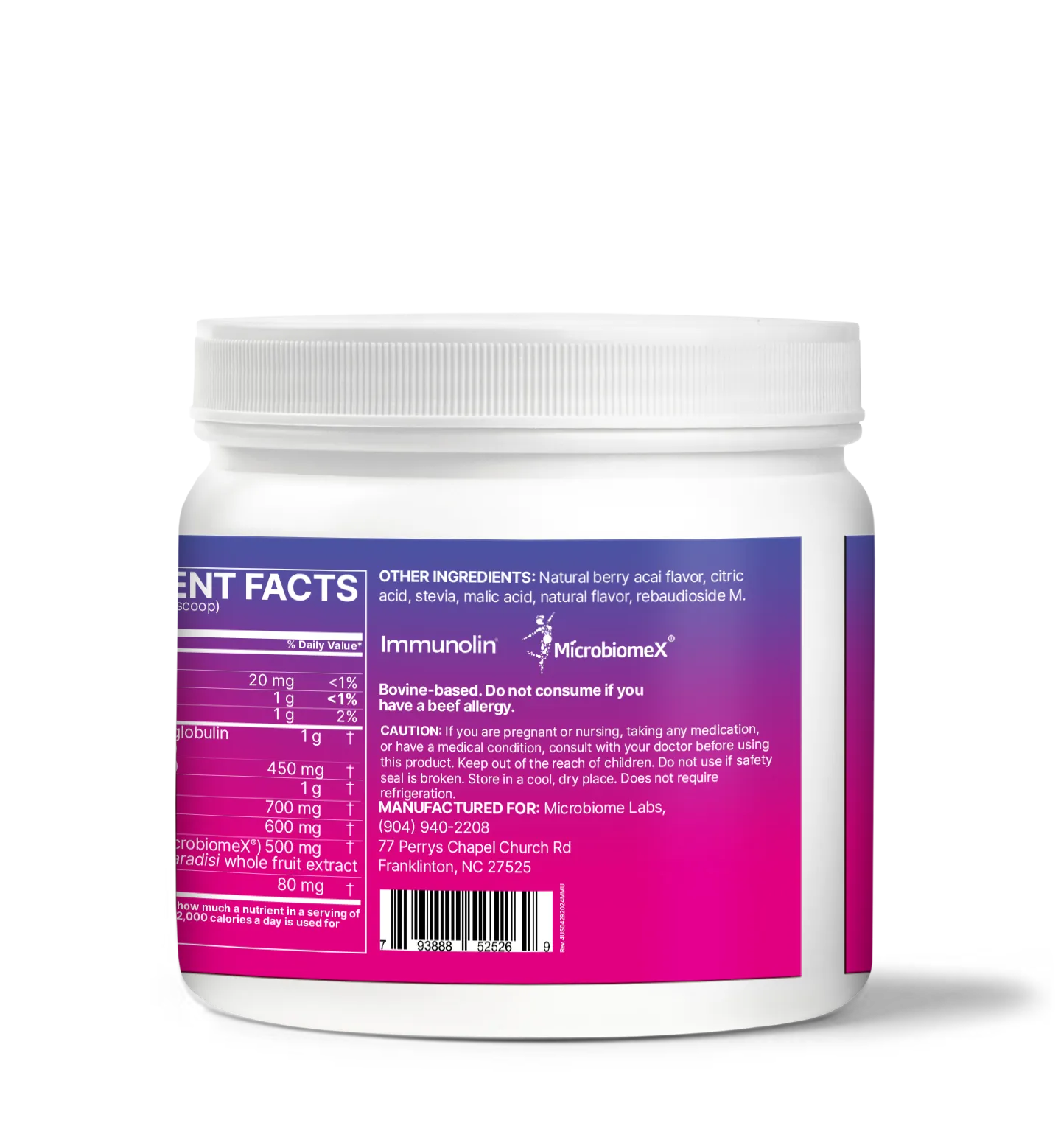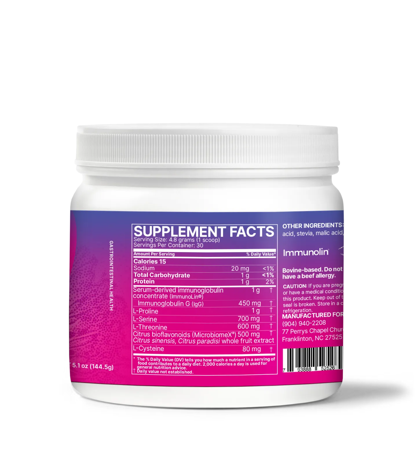 Serum-derived immunoglobulin concentrate (ImmunoLin), Immunoglobulin G (IgG), L-Proline, L-Serine, L-Threonine, Citrus bioflavonoids (MicrobiomeX) Citrus sinensis, Citrus paradisi whole fruit extract, L-Cysteine, Natural berry acai flavor, citric acid, stevia, malic acid, natural flavor, rebaudioside M.