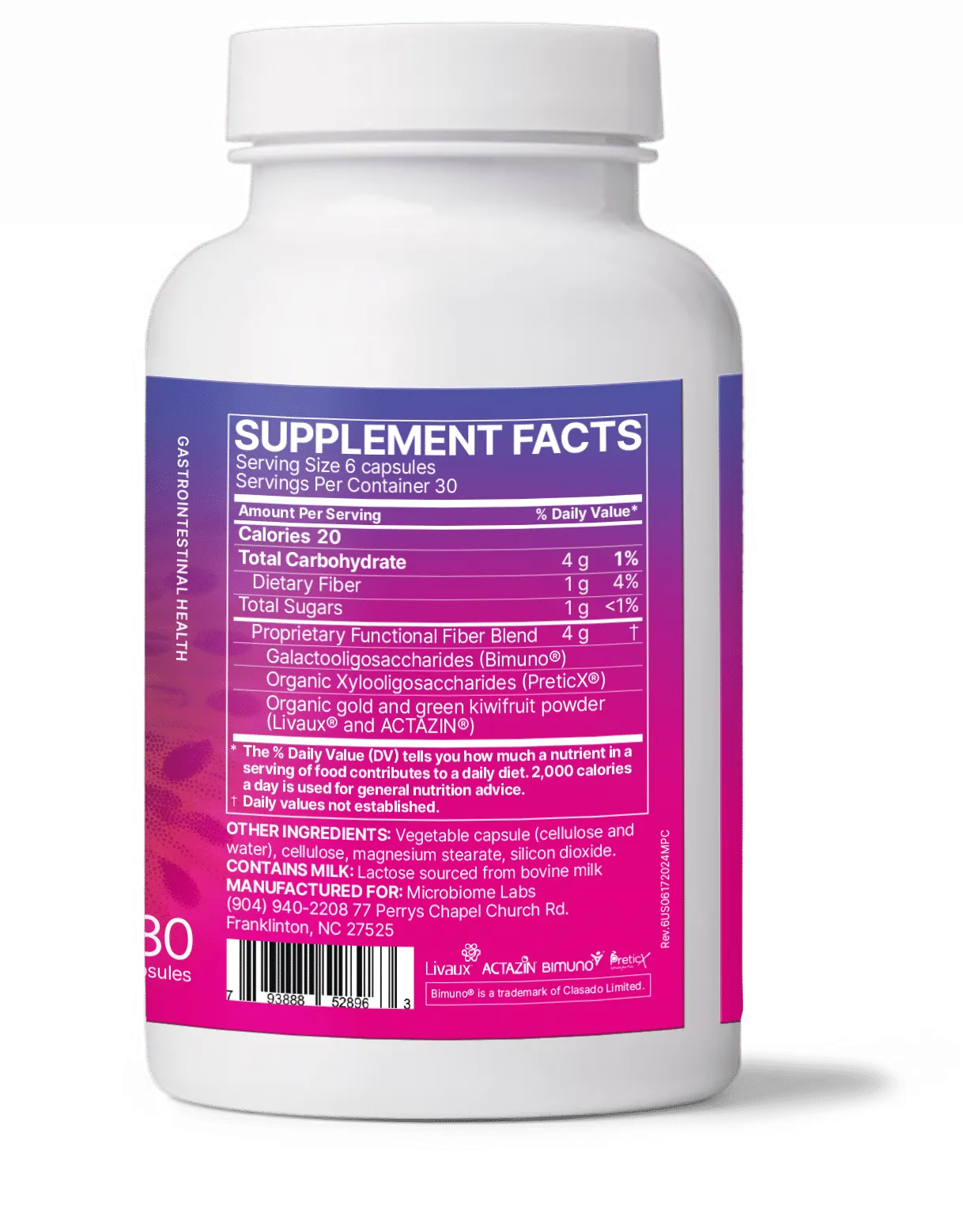 Galactooligosaccharides (Bimuno®), Organic Xylooligosaccharides (PreticX), Organic gold and green kiwifruit powder (Livaux® and ACTAZIN), Vegetable capsule (cellulose and water), cellulose, magnesium stearate, silicon dioxide.