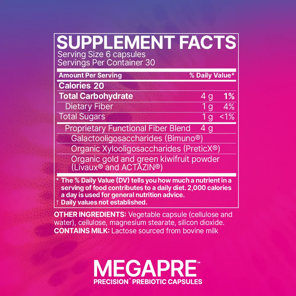 MegaPre is a precision prebiotic that reinforces a strong and diverse microbiome by selectively feeding beneficial bacteria and promoting gut health.