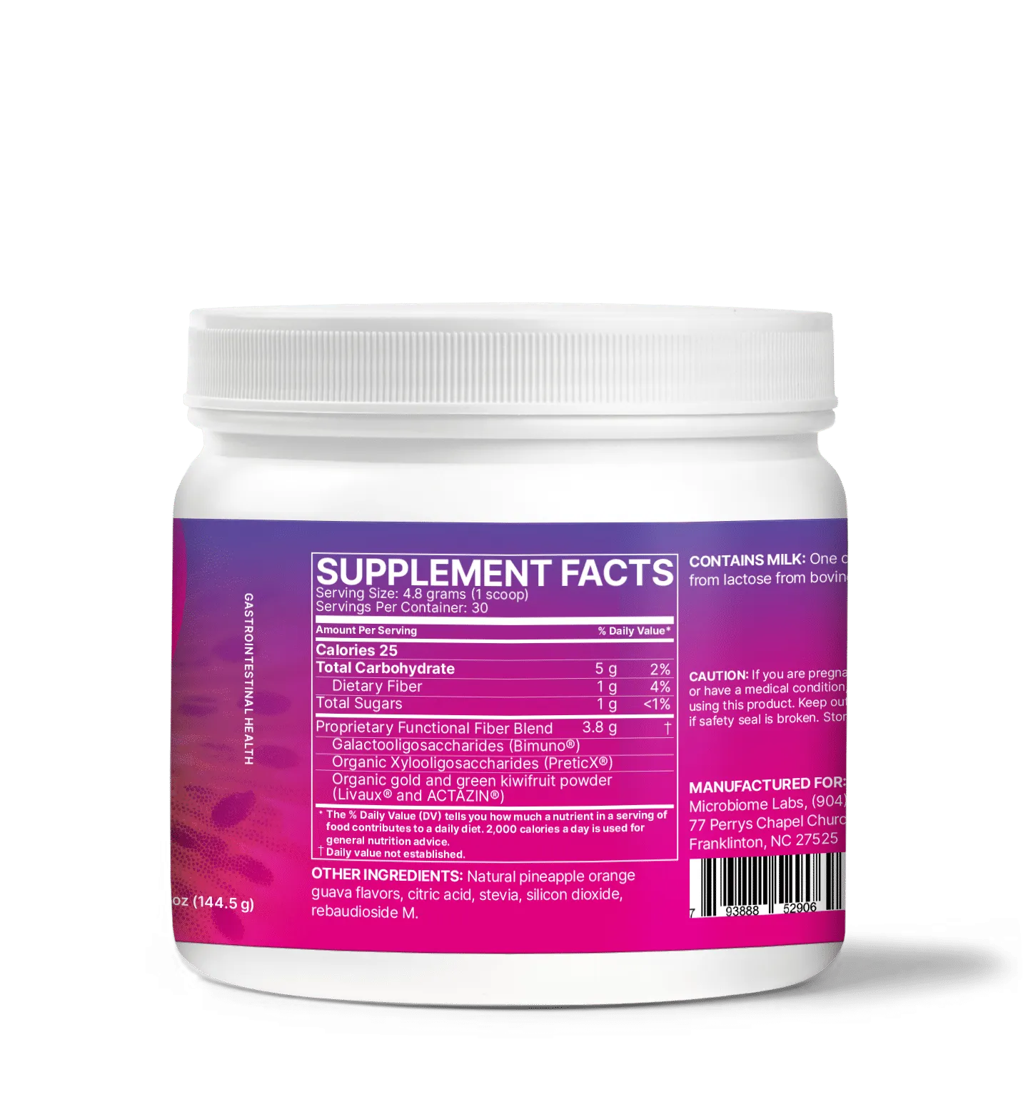 Galactooligosaccharides (Bimuno®), Organic Xylooligosaccharides (PreticX), Organic gold and green kiwifruit powder (Livaux® and ACTAZIN), Natural pineapple orange guava flavors, citric acid, stevia, silicon dioxide, rebaudioside M.