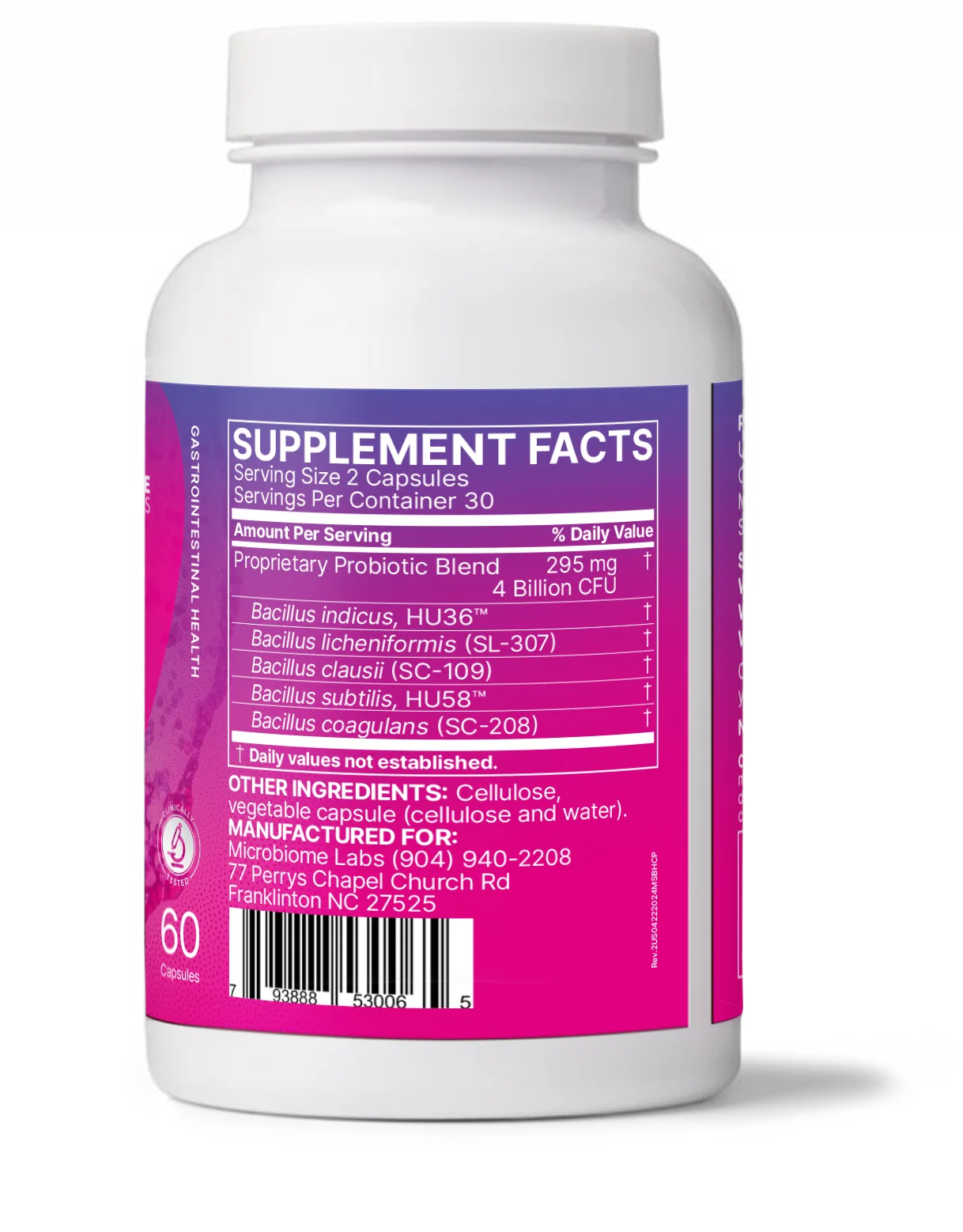 Bacillus indicus, HU36, Bacillus licheniformis (SL-307), Bacillus clausii (SC-109), Bacillus subtilis, HU58, Bacillus coagulans (SC-208), Cellulose, vegetable capsule (cellulose and water).
