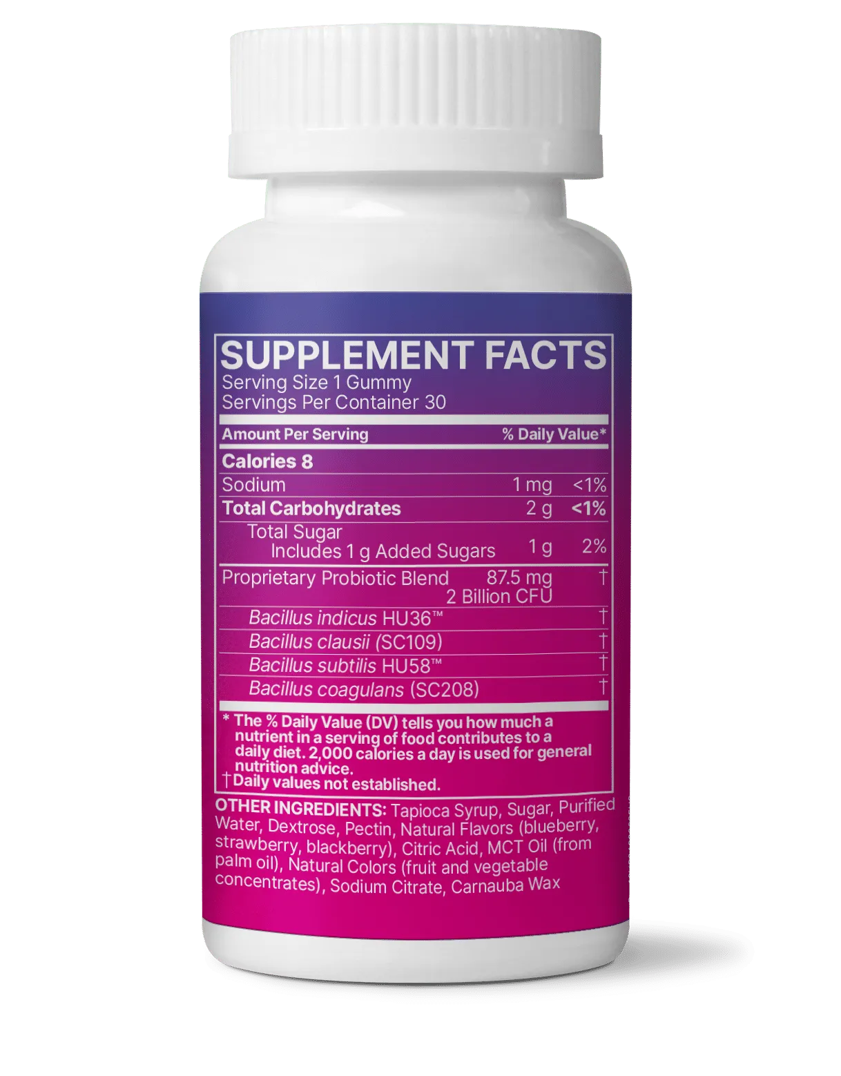 Bacillus indicus HU36, Bacillus clausii (SC109), Bacillus subtilis HU58, Bacillus coagulans (SC208), Tapioca syrup, organic cane sugar, purified water, pectin, and natural flavors (blueberry, strawberry, blackberry). Contains less than 2% of: citric acid, citrus fiber, MCT oil, natural color, sunflower lecithin.
