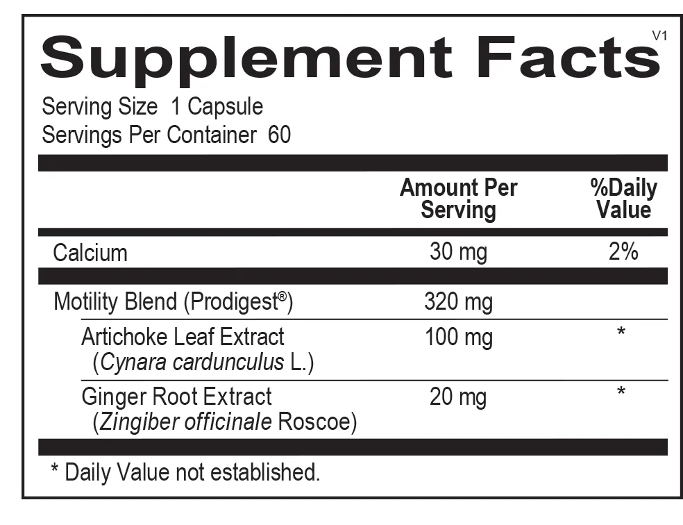 Calcium, Motility Blend ((Prodigest®)), Artichoke Leaf Extract ((Cynara cardunculus L.)), Ginger Root Extract ((Zingiber officinale Roscoe))