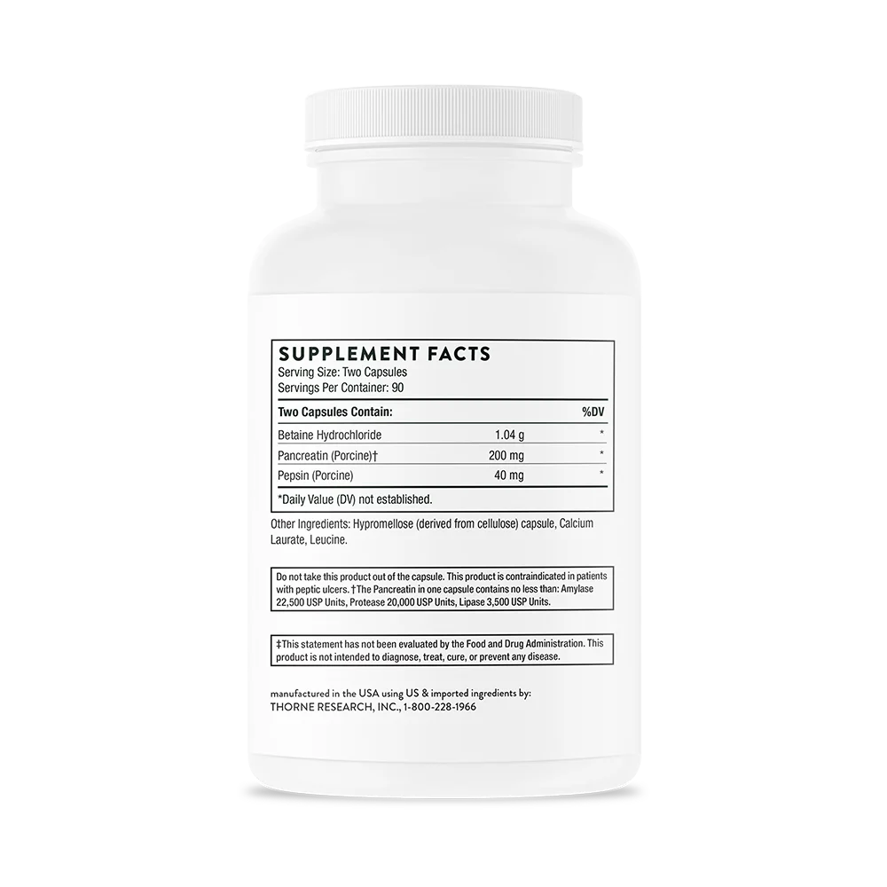 Betaine Hydrochloride, Pancreatin (Porcine), Pepsin (Porcine), Hypromellose (derived from cellulose) capsule, Calcium Laurate, Leucine. Do not take this product out of the capsule. This product is contraindicated in patients with peptic ulcers. †The Pancreatin in one capsule contains no less than: Amylase 22,500 USP Units, Protease 20,000 USP Units, Lipase 3,500 USP Units.