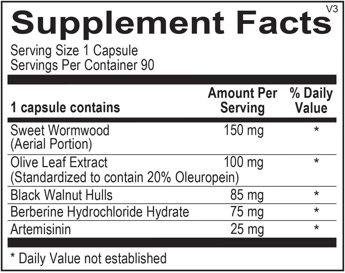 Sweet Wormwood (Aerial Portion), Olive Leaf Extract (Standardized to contain 20% Oleuropein), Black Walnut Hulls, Berberine Hydrochloride Hydrate, Artemisinin