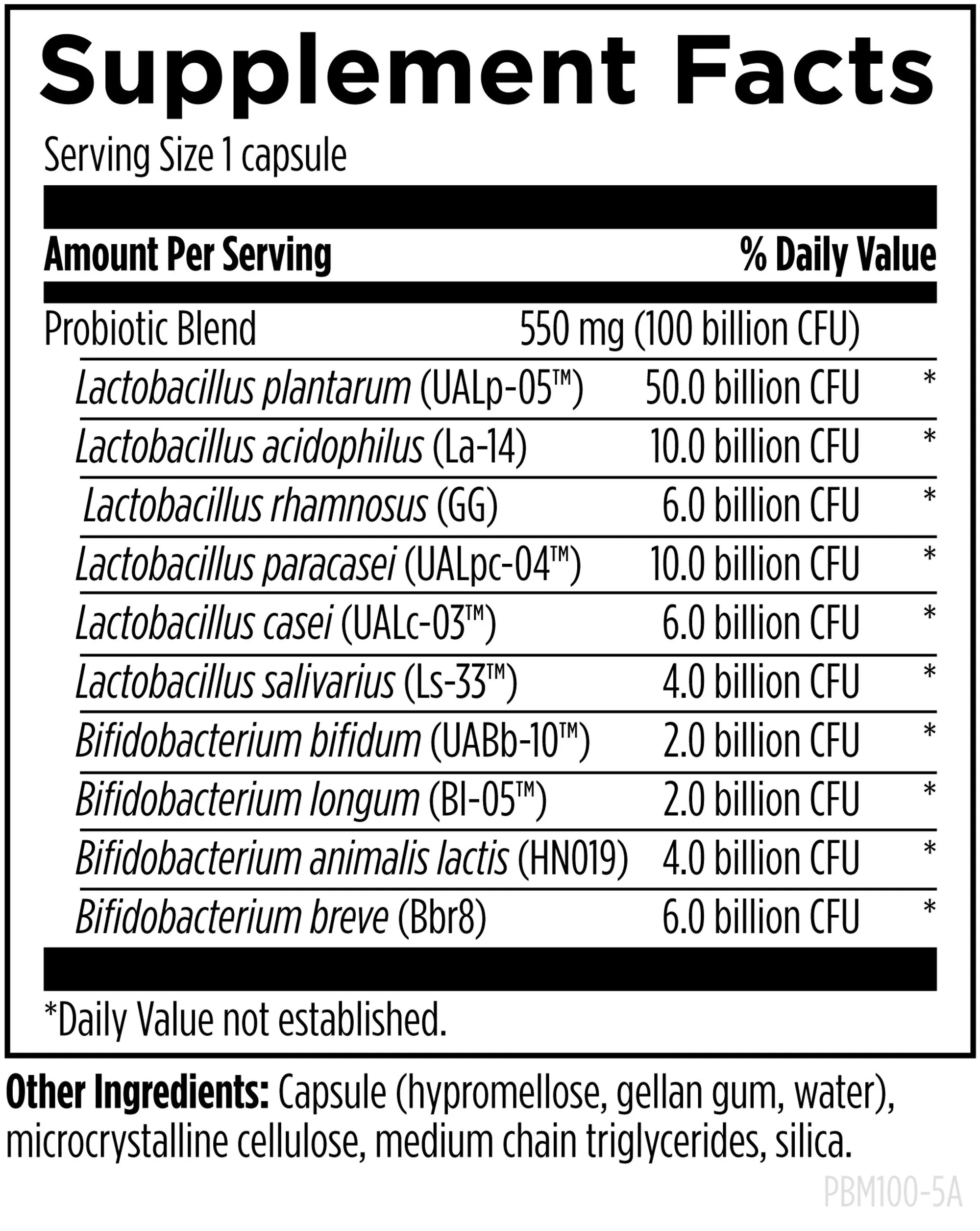 Probiotic Blend (100 billion CFU), Lactobacillus plantarum (UALp-05™), Lactobacillus acidophilus (La-14), Lactobacillus rhamnosus (GG), Lactobacillus paracasei (UALpc-04™), Lactobacillus casei (UALc-03™), Lactobacillus salivarius (Ls-33™), Bifidobacterium bifidum (UABb-10™), Bifidobacterium longum (Bl-05™), Bifidobacterium animalis lactis (HN019), Bifidobacterium breve (Bbr8), Capsule (hypromellose, gellan gum, water), microcrystalline cellulose, medium chain triglycerides, silica.